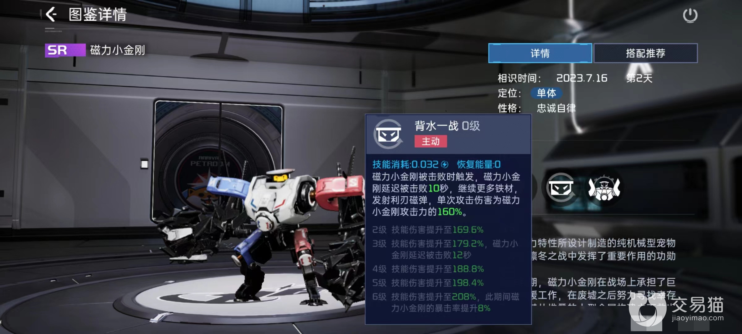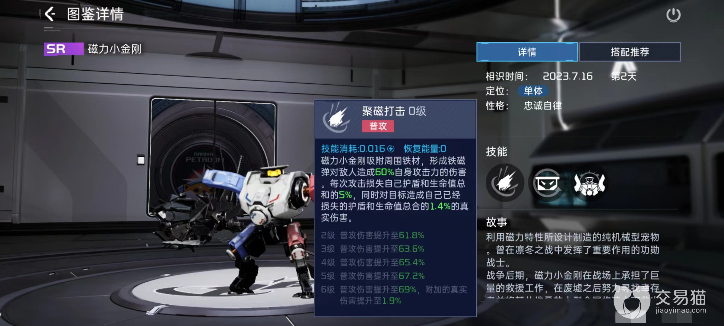 这是利用磁力特性所设计出来的纯机械型宠物,曾经在战争中立下过重要功勋。普攻技能聚磁打击,能吸附周围铁材形成铁子弹伤害单体目标。每次攻击将会以损失自己护盾和生命值总和百分比为代价,对目标造成更高伤害。在技能达到6级时,附加真实伤害能提升至自身已经损失护盾和生命值总和1.9%。真实伤害是现在最有效攻击方式,无视对方防御,对抗一些boss型怪物时非常好用。