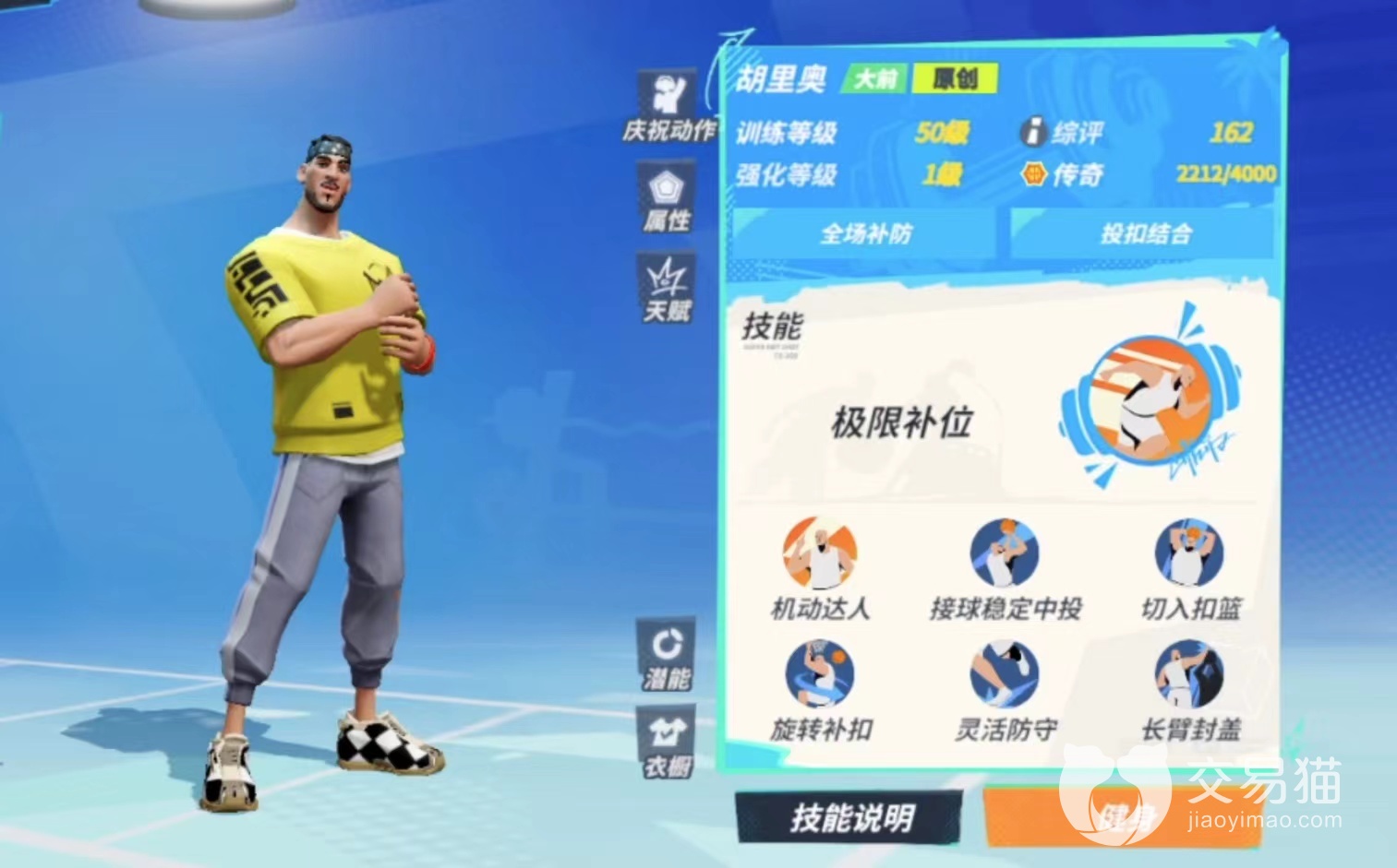 我们先了解胡里奥的技能:他的大招是光速抢断,运用灵活性快速抢断对面的球,他的附加技能时在离篮筐4.5米时可以快速的完成扣篮。从这里,我们可以看出胡里奥是个机动性和灵敏性都很强的球星,再加上一些他适合的潜能就是个全能性的球星。但是他的缺点还是明显的,无论是技能还是特点都是有漏洞的,比如他的激动性MAX但他的投篮的精准性能很差。