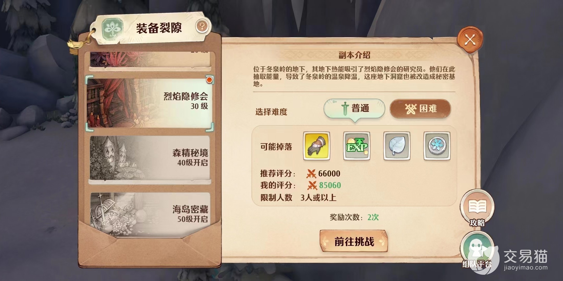以上就是目前的森之国度装备裂隙怎么玩的内容分享了,在副本中有战力提示,只要是能超过它的战力要求,在战斗的时候注意技能提示进行闪避都是能通过的。当战力远远超过副本要求的时候通关是没有奖励的,所以要选择适合自己的装备副本。
