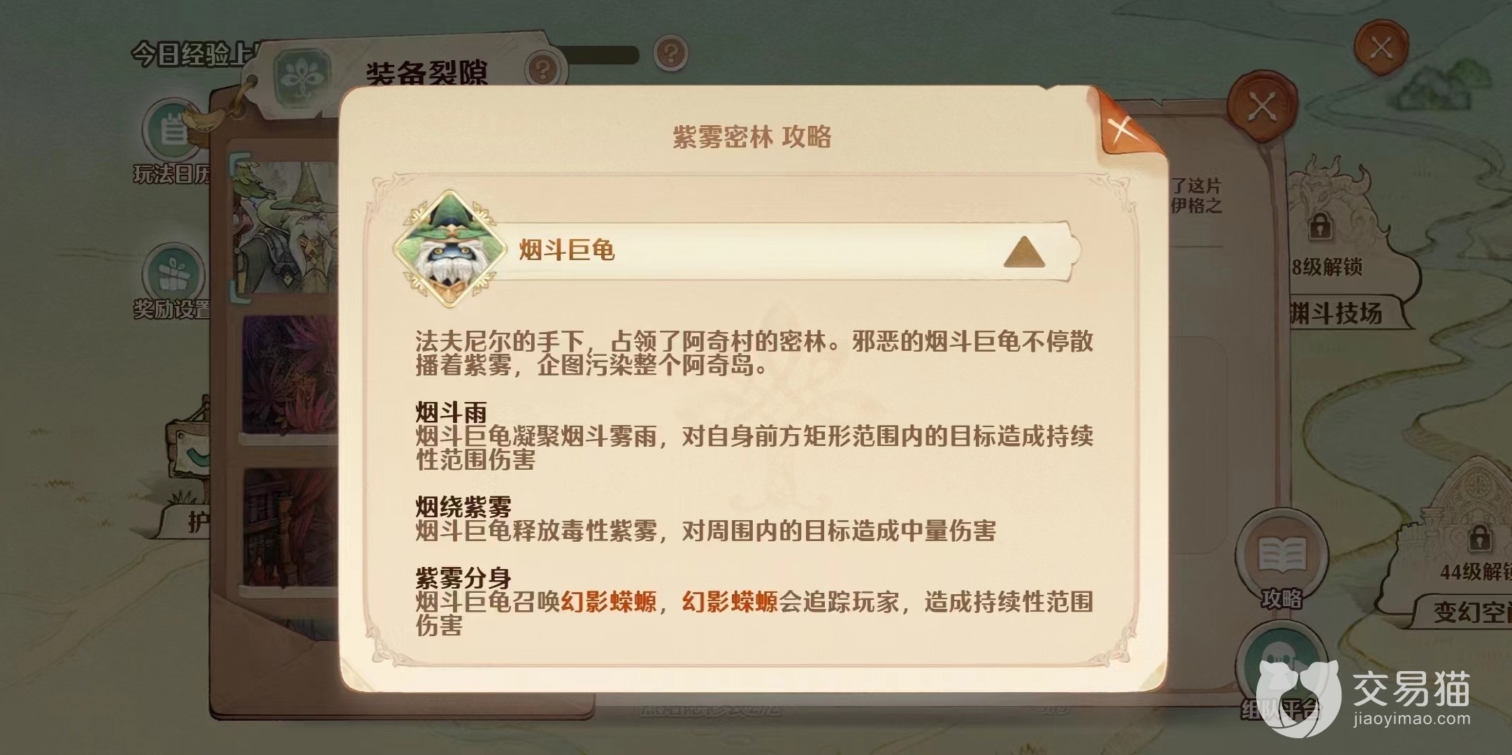 紫雾森林副本是boss的烟斗巨龟,它的技能分别有烟斗雨、烟绕紫雾、紫雾分身。烟斗雨会对矩形范围内的玩家造成持续性的伤害,烟绕紫雾会随机给玩家造成中等程度的的伤害,紫雾分身是它的绝技。会召唤两个幻影,造成范围内持续性的伤害。