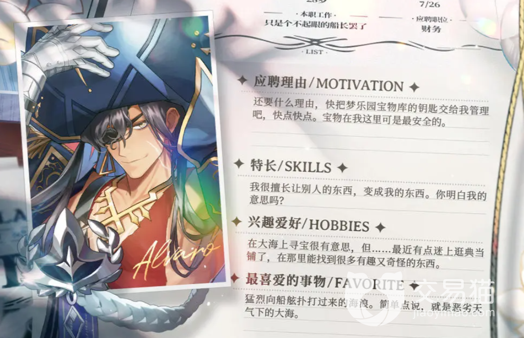 欢迎来到梦乐园阿尔瓦罗怎么样呢?其实他表面英俊硬朗,是个坏坏的人,更加喜欢刺激有趣,充满冒险的旅途。跟着他你的生活就不会变得无聊,在大海上能够遇到各种新奇的事情。凭借着他三寸不烂之舌,还能讨你的欢心。