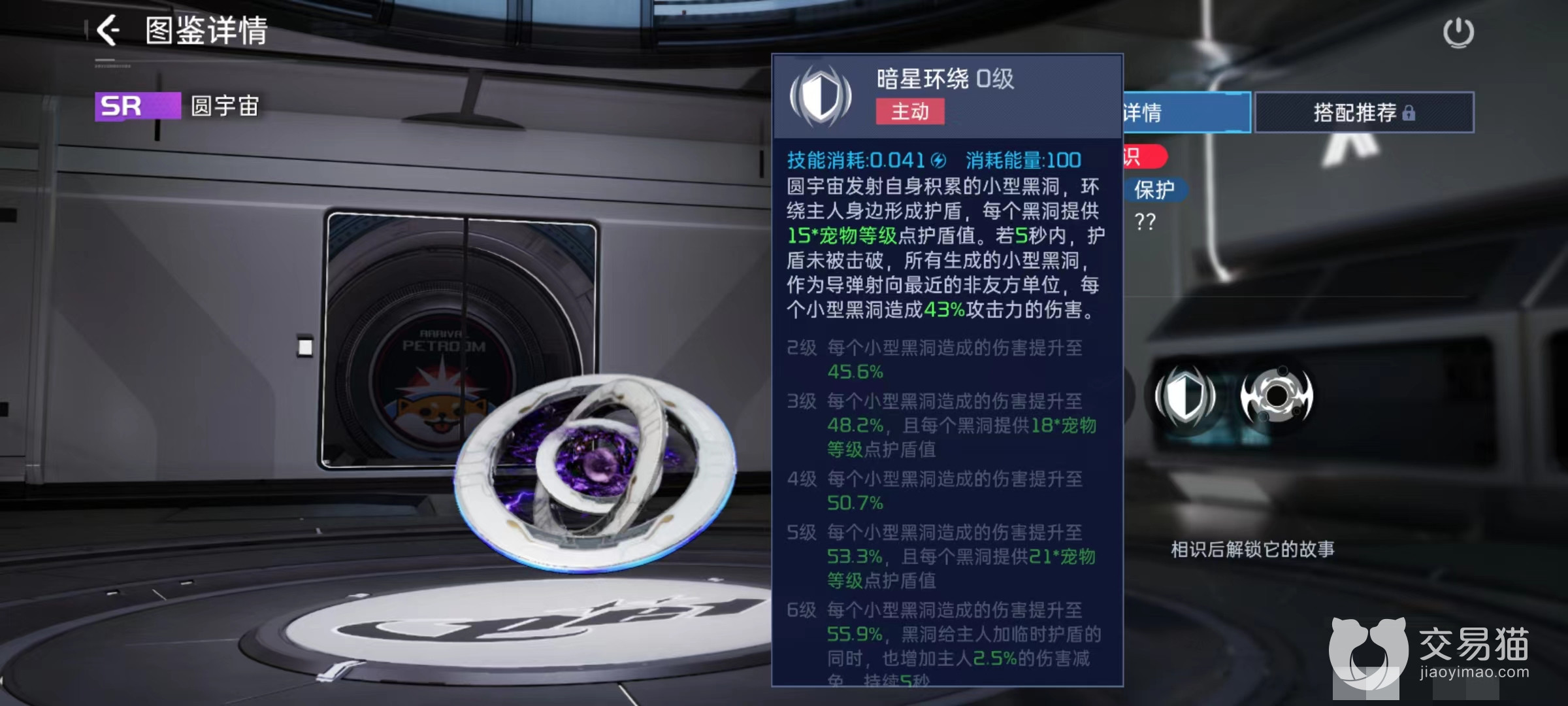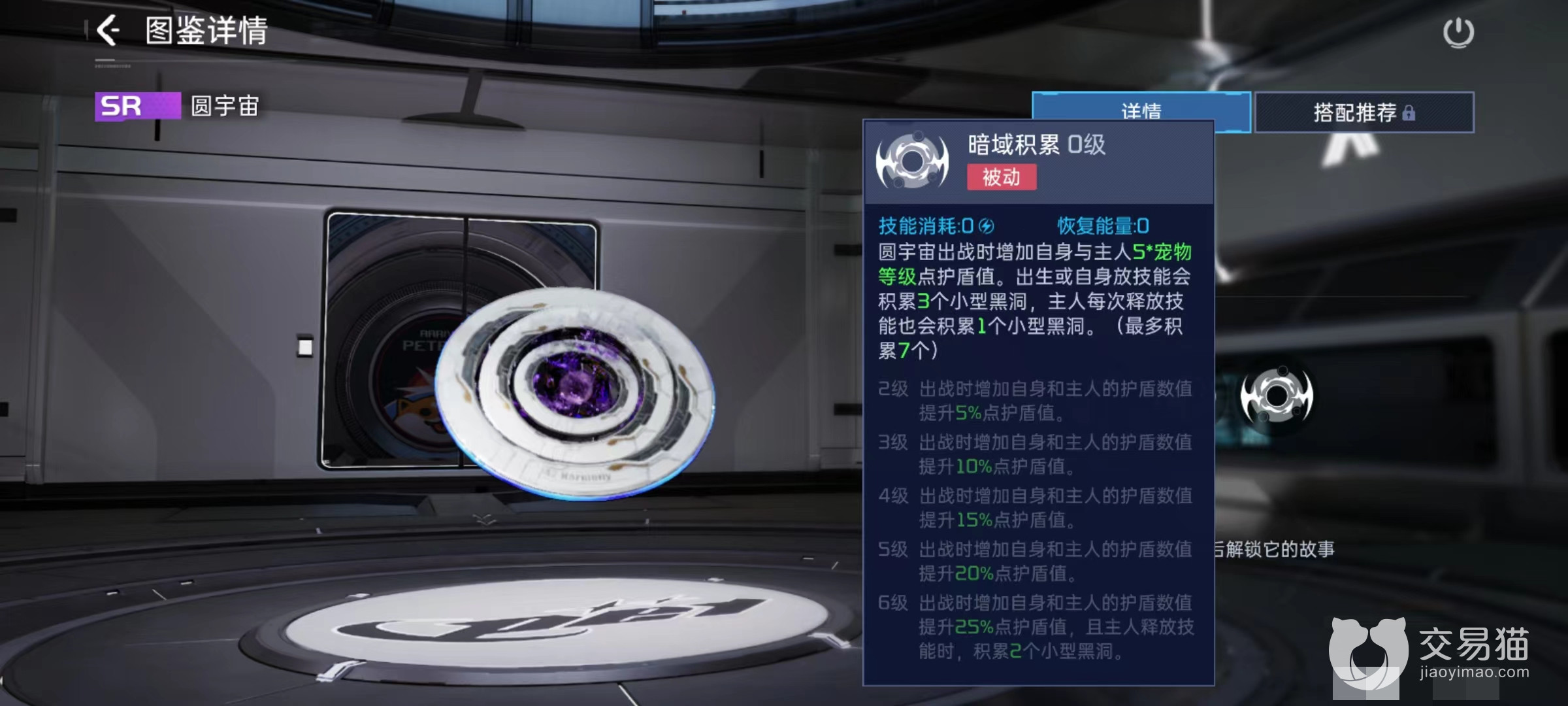 被动技能暗域积累,当园宇宙出战时,能够增加主人身上护盾值,出生或是自身放技能都会积累3个小型黑洞,主人释放技能也会生成1个黑洞,最多能积累7个。这些积累起来的黑洞就用于主动技能释放,通过提升技能等级达到6级时,出战时增加的护盾数值大幅提升,主人释放技能时能生成2个小型黑洞,叠加起来更快。
