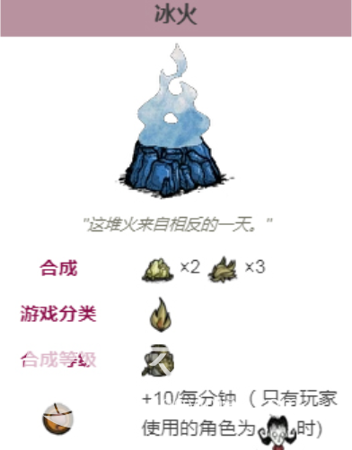 冰火的直接作用不是保温而是给夏天的各位降一下温度,是非常有趣的一个设定,在温度过高的时候玩家将会受到伤害,所以使用这个篝火可以降低玩家受到的伤害,这样可以保证各位在夏天也不会被酷暑折磨。