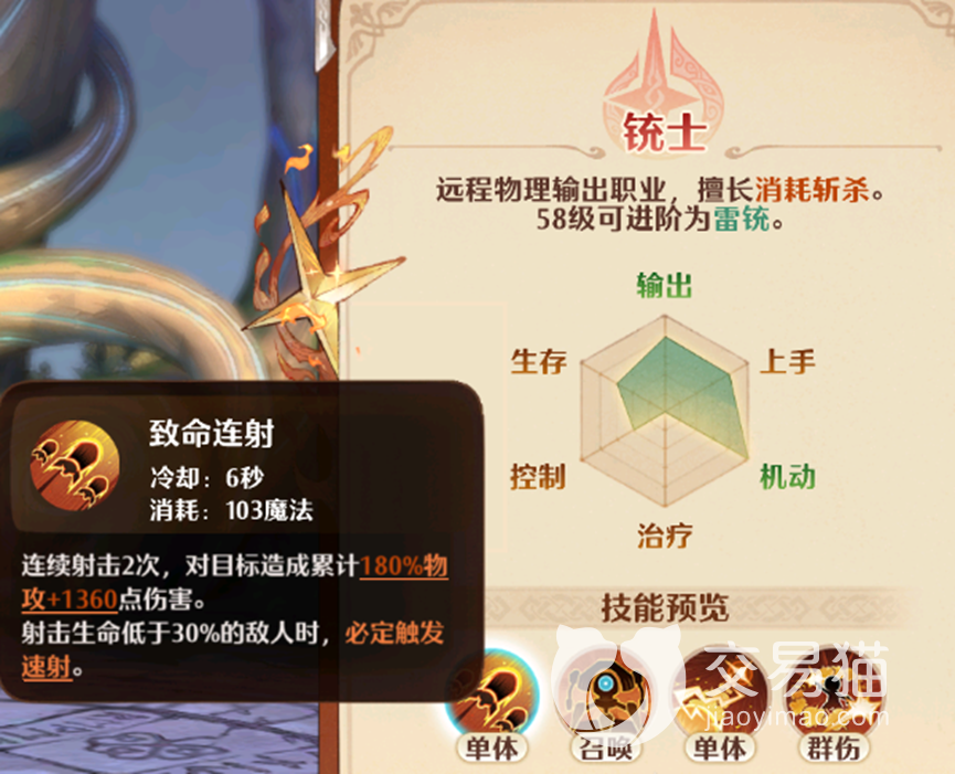 铳士装备着强力的双枪武器。他拥有广泛的战斗选择,可以执行群攻和单体攻击。铳士的技能使用方式多样,可以选择读条施放或瞬发技能,根据战斗情况决定最佳的技能组合。在战斗中他们可以召唤机械伙伴作为战斗支援,在火花与机械声的交织中灵活回旋。