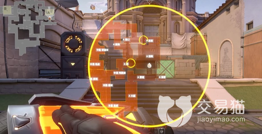 以意境空岛这张图为例,用球烟在A点是有两个点要封烟的,一个是A小这个地方,一个是二楼,这是我们打A点最常封的2个点,使用欧门或者布史东都可以很好的完成封烟。