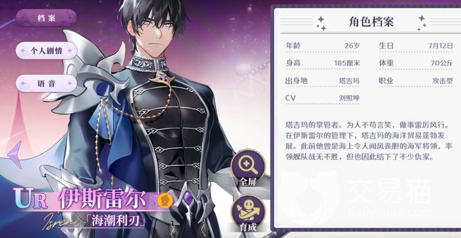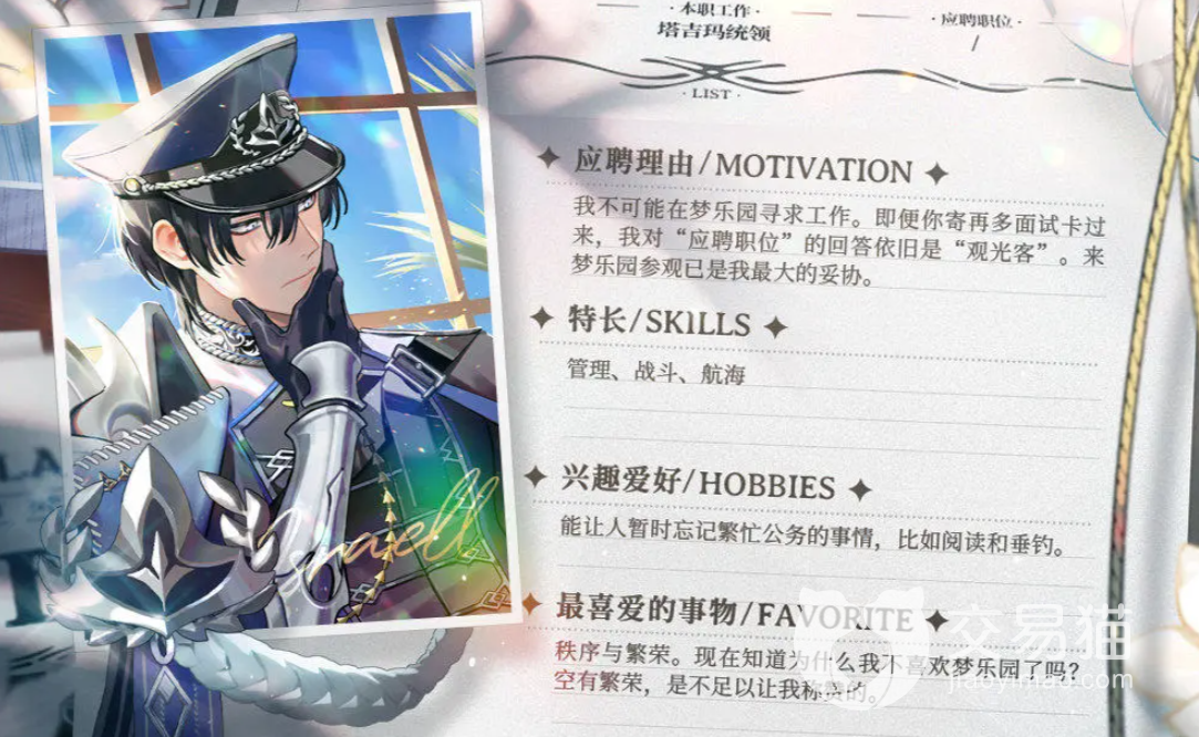这样的人其实让人感到更安心,可以让他只属于你一个人,并且遇到各种各样的问题他都能帮你解决,没有后顾之忧。来到梦乐园就是他最大的妥协,是对人们的恩赐,所以不要妄想着掌控他。他擅长的事情是出海、管理,战斗能力出色。