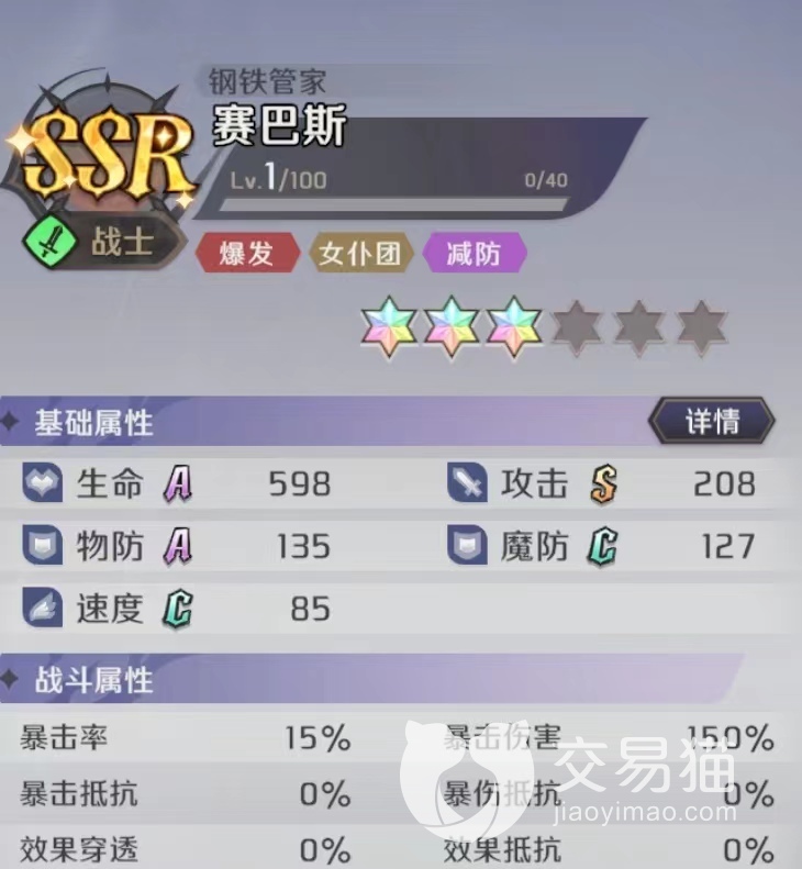 追求输出的小伙伴可以选择赛巴斯作为抽卡结果,主打的就是一个高爆发单体输出,而且可以配合女仆配队,就算不靠3技能输出也非常高,对高防角色也有应对能力。
