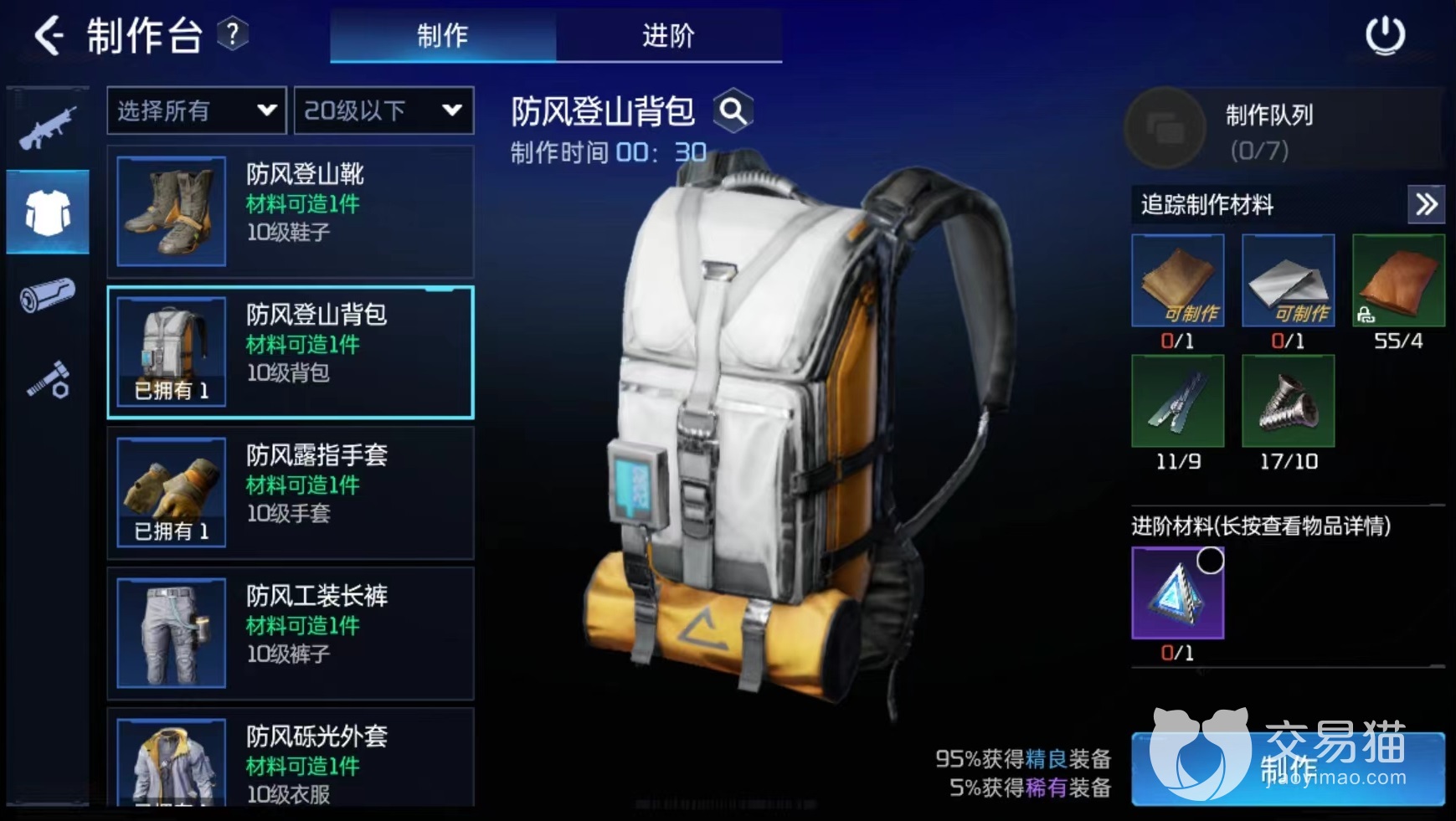 防风登山靴能够在复杂地形中行走,非常舒适透气,而且设计外观好看,需要一张粗布条,2块塑料,4张轻皮,9个拉链和10块镜片,增加13攻击力和7暴击强度。防风登山背包材质坚固耐用,能够在户外恶劣环境下使用,增加9格背包容量,23生命值,55护盾。