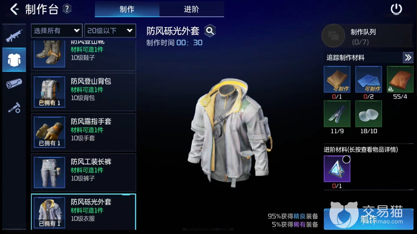 防风露指手套采用了露出手指设计,便于户外操纵各种机械,材料中柔韧程度较高,有效避免划伤,增加13攻击,7暴击强度。需要一张粗布条,1块陶瓷,4张轻皮,9个拉链和11个螺丝钉。防风工装长裤采用了常规工装裤款式,额外增加能量罐腿包,方便户外步行使用,增加12生命,27护盾,12防御。一张粗布条,一块陶瓷,4张轻皮,9个拉链,10个镜片。