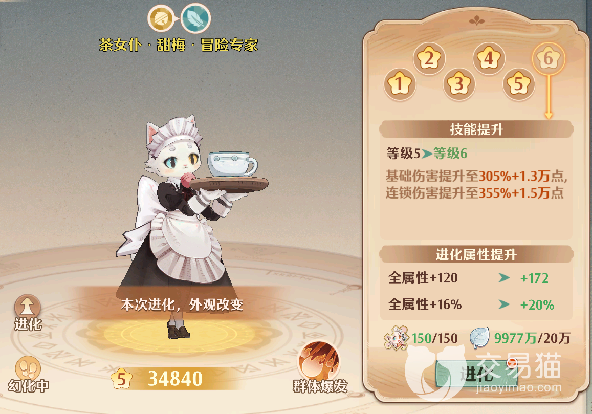 除了升星以外,部分猫灵通过进化也是可以获取新外观的,不过这些猫灵往往都是稀有中的稀有,因此入手门槛比较高,典型的就像“茶女仆”,入手他之后需要先将其培养到一定程度,然后使其幻化跟随,之后的下一次进化她即可获得全新外观!