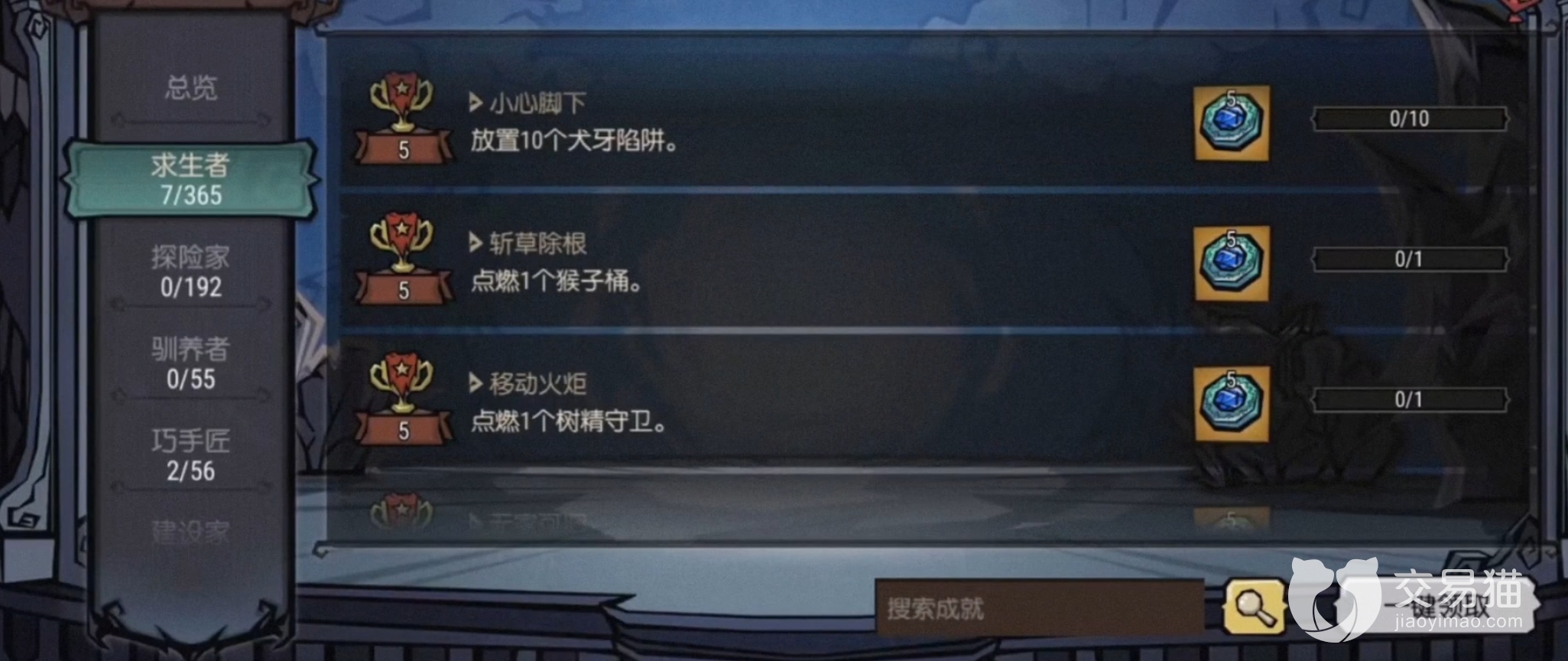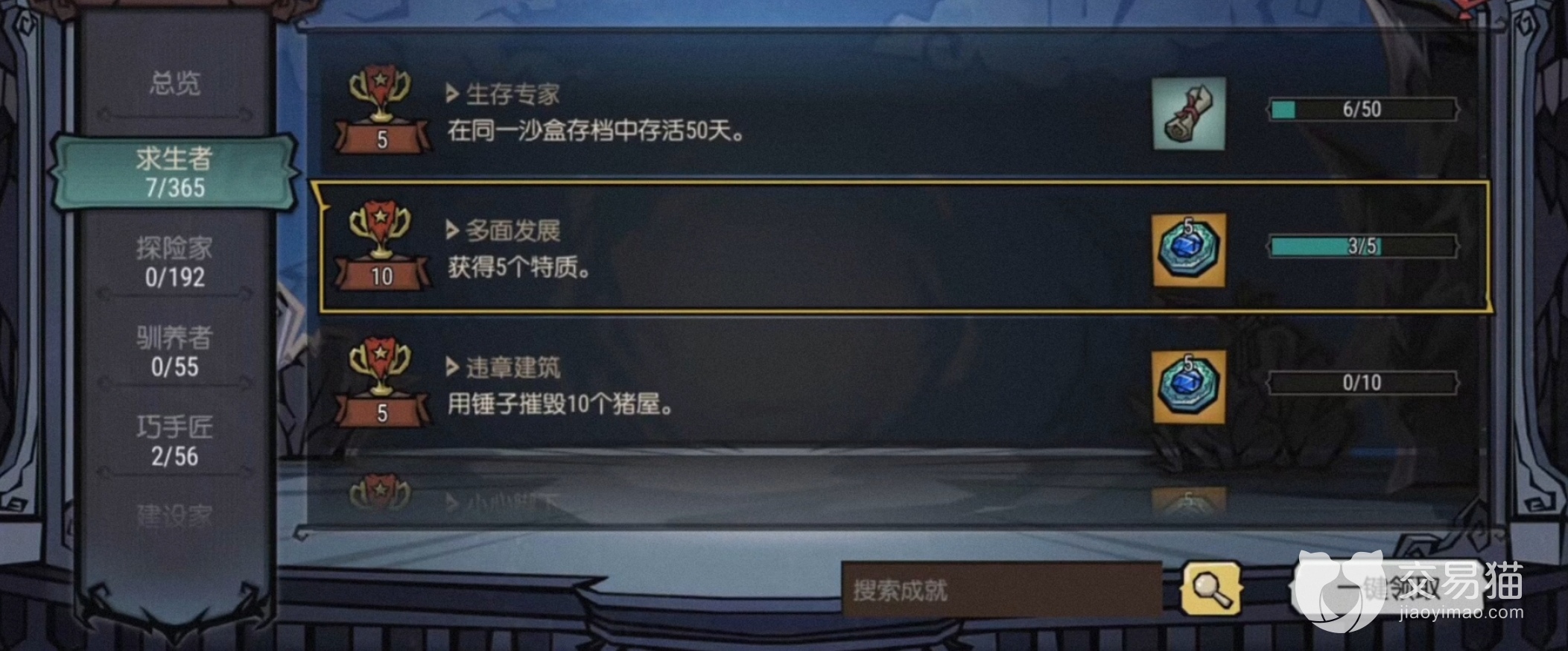 1.生存专家:玩家需要在同一个沙盒世界中存活50天的时间,就能完成这一成就点;2.多面发展:玩家需要获得五个特质才可以达成该成就点;3.违章建筑:游戏里的猪人村落中是有很多不规范的小屋子滴,玩家只要用锤子摧毁10个猪屋就行;4.小心脚下:在游戏中,玩家可以依靠陷阱来抓捕动物,大家只要放置10个犬牙陷阱便可完成这一成就点;5.斩草除根:点燃1个猴子桶就能达成这一成就点;6.移动火炬:玩家在探索的时候,会遇到一些妖精树精,拿火炬点燃一个树精守卫就能完成该成就点。