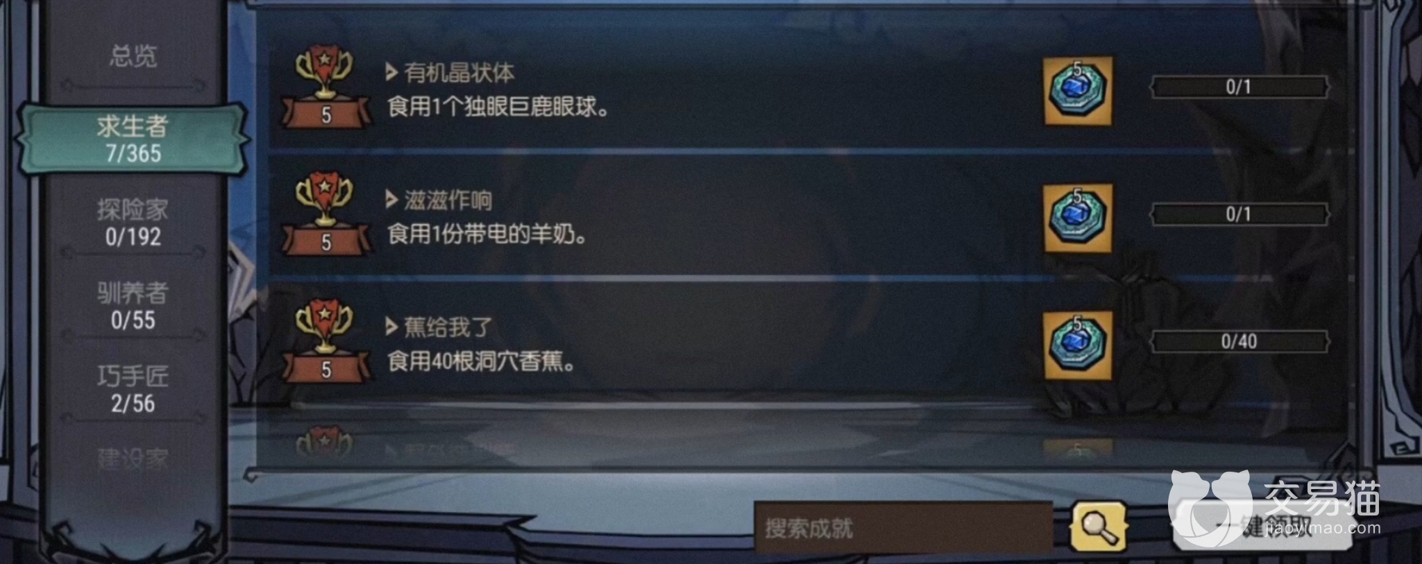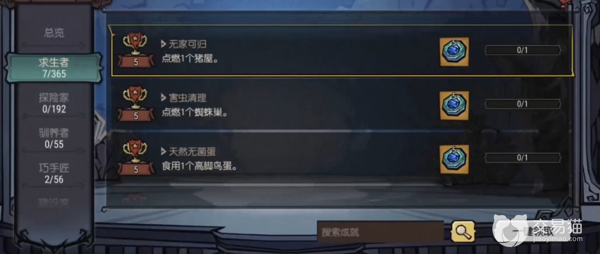 7.无家可归:玩家用火炬点燃一个猪人房屋就能完成;8.害虫清理:蜘蛛在游戏里算是一类害虫,玩家点燃1个蜘蛛巢就算是清理了害虫啦;9.天然无菌蛋:食用1个高脚鸟蛋来补充体力就能达成这一成就;10.有机晶状体:食用1个独眼巨鹿眼球,听起来略有恐怖,不过,其实这一食物还是很好获得的;11.蕉给我了:玩家需要食用40根洞穴香蕉来达成它,好在洞穴香蕉很容易采集。