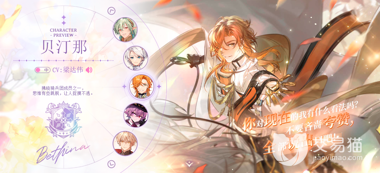 第三个叫贝汀那,也是洛维斯王国的拂晓骑士团一员,在骑士团当中他是最为年长的,虽然年龄比较大,但是性格却有点吊儿郎当,不着调儿,工作的时候最喜欢的就是摸鱼。不过他外形还是很好看的,一头绚烂的橙金发,看起来就像一个热烈张狂的王子一样,好似一个火热耀眼的太阳。