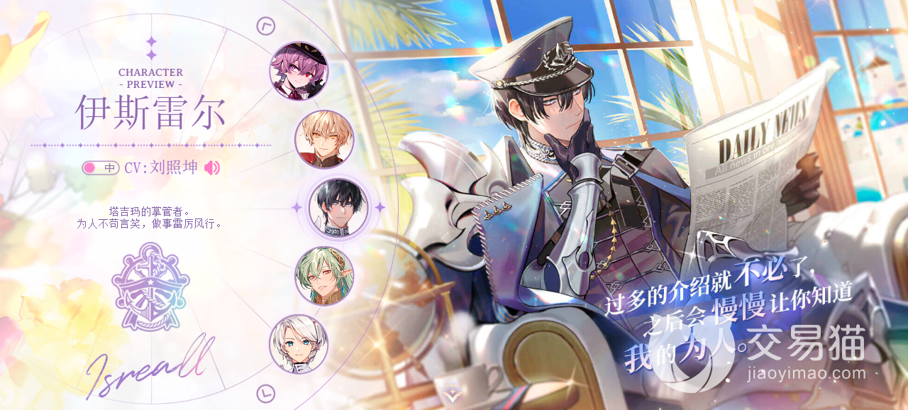 第五个是伊斯雷尔,他也是新手十连招募必得的角色之一,作为塔吉玛的掌管者,他的性格十分强势,大小事务往往都由他裁决,说一不二,不允许有人反驳他。与他形象符合的是他有着一头黑色的短发,穿着一身的正装,看起来就很严谨,一丝不苟。