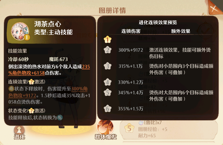 技能【沏茶点心】:需要消耗673点魔力值,同时释放技能需要60秒冷却时间,甜梅倒出滚烫的热水对前方6名敌人造成235%的角色物攻,同时附加6158点额外伤害,如果在【群体爆发】状态下使用这个技能的话,伤害会提升至300%的物攻,同时1.5秒后会造成35%的攻击伤害和1058点烫伤伤害,这个猫灵的技能在进化到6星的时候,烫伤是可以对个目标叠加的。