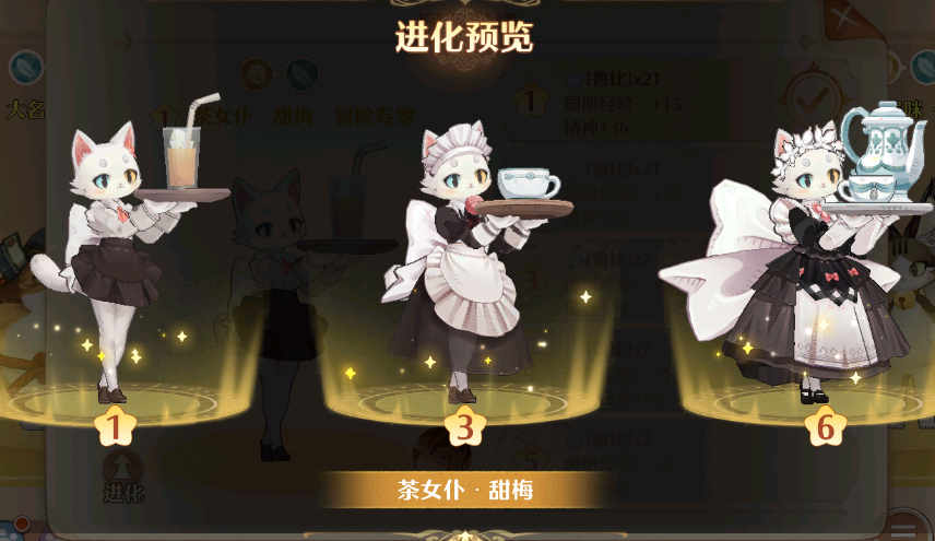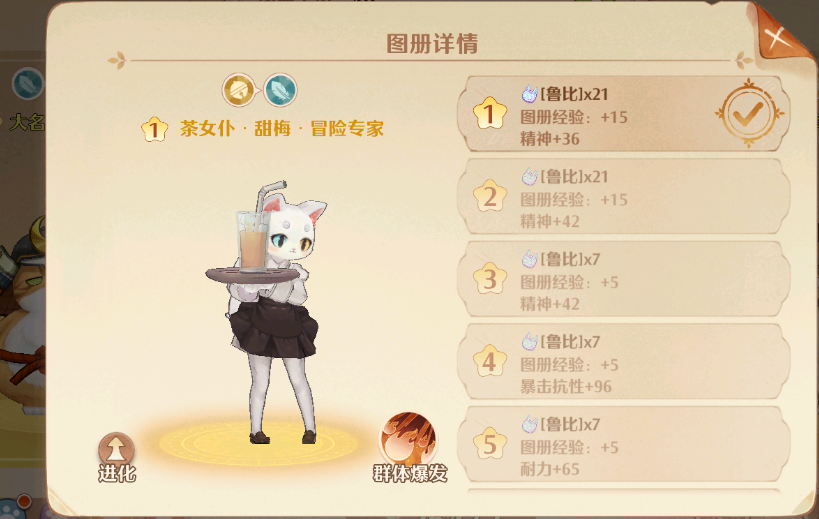 茶女仆·甜梅这个猫灵的属性是【冒险专家】和【群体爆发】,技能伤害属于一个群体爆发型的,而且猫灵一共是可以进化6次的,从第一次的进化上可以增加猫灵36点精神值,第二次和第三次进化可以增加42点精神值,第四次进化增加96点抗暴击性,第五次进化会获得65点耐力值,第六次进化会获得144点抗暴击性。