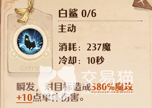 另外四技能“白鲨”是一个单体伤害技能,它会瞬发释放,之后造成380%魔攻+10的伤害,升满级后固定伤害会大大提升,并解锁“高伤”和“单体”两种分支,前者会以多一秒的吟唱时间为代价造成更高的伤害,这个伤害不只是固定伤害的提升,魔攻加成也由原本的380%提升到了500%。后者的话则是伤害不变,但攻击目标的数量扩大到三人。