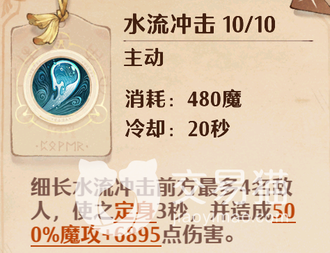 三技能“水流冲击”同样是一个AOE技能,它可以攻击前方的四名敌人,对它们进行三秒定身的同时,还会施加魔攻加成较高的一次伤害,这个伤害还不是极限,通过最高十级的提升其本身的固定伤害也会增加。它拥有两种分支,分别走向群控或单控,前者会扩大技能范围,从而确保四名敌人皆被定身,后者则会将定身敌人的数量缩减至一个,但会延长三秒定身时间!