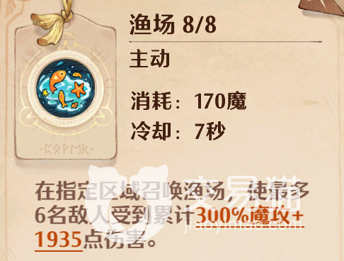 第二技能“渔场”则是一个群伤技能,可以在目标区域生成渔场从而对敌人造成可观的AOE伤害,不过区域内最多只会有六名敌人受到切实伤害,通过八次升级可以令渔场的基础伤害获得进一步提升,此后还可点亮它的分支,从而使其走向“减速”和“连招”这两个不同的方向,选择前者技能的范围会变大,并且对其中的敌方目标施加减速效果,选择后者则会在范围不变,伤害略增的基础上,再附加190点精准,从而确保技能的稳定命中。