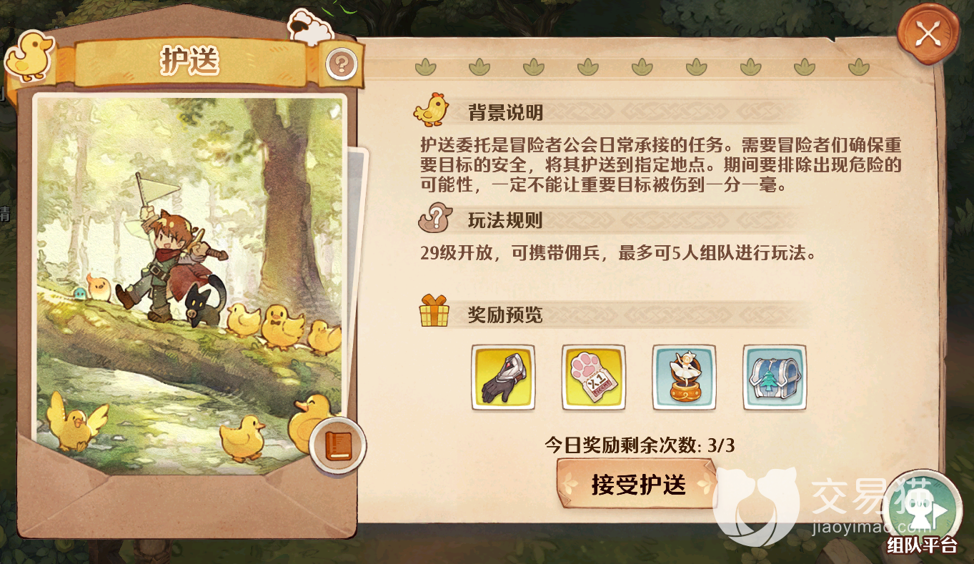 护送:这个是分布在贤者森林中的一种特色玩法,通过参与该玩法能够获取装备,猫灵扭蛋券等珍稀奖励,它本身的玩法模式是让一只可爱的萌物跟着你的队伍,然后你和其他玩家或者佣兵需要护送它安全到达另一地点。
