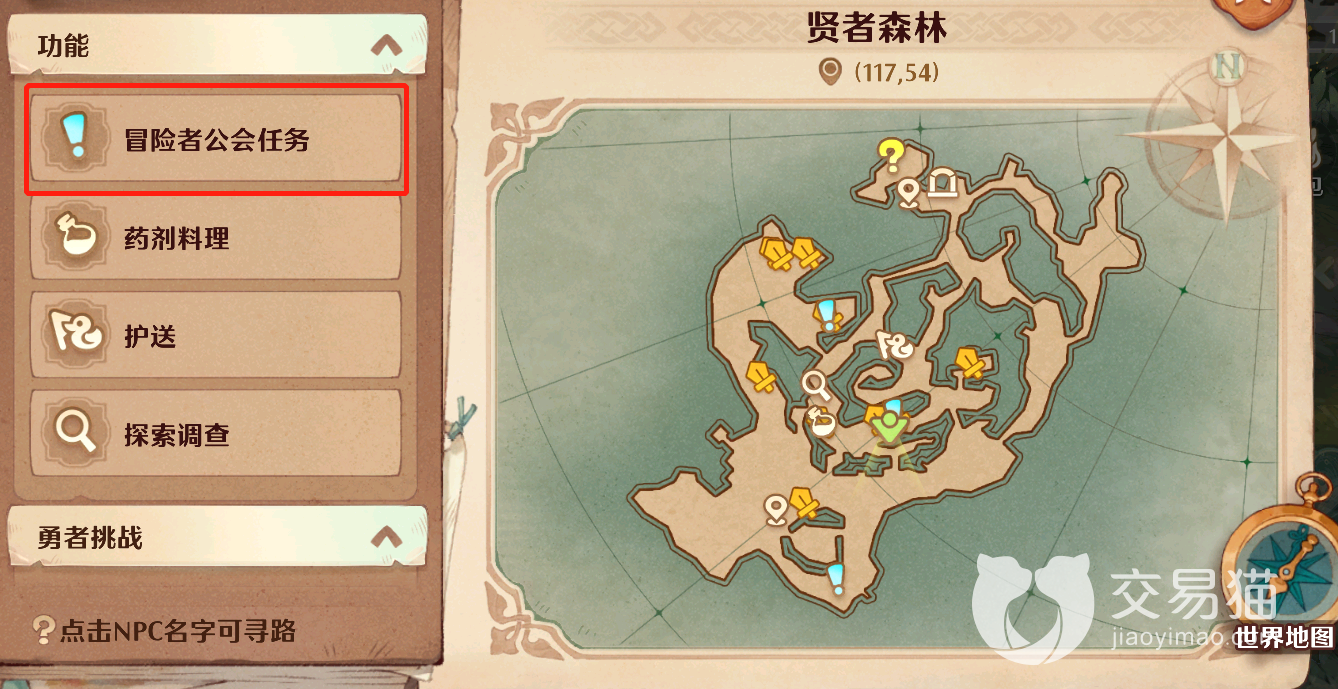 先打开右边的地图,然后进入世界地图点击贤者森林,之后就可以看到它的地图板块,左边有一个“冒险者公会任务”的功能选项,之后点击它就可以展开自动寻路,经过系统的自动寻路,你会被带到如下图所示的这个地方。