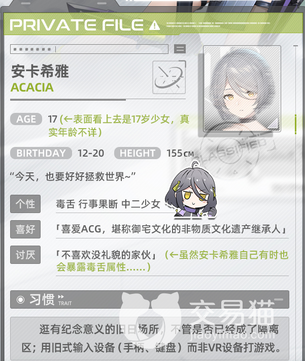 安卡希雅隶属于特种部队,最擅长的就是利用自己的机械臂武器进行对战,习惯于用高频的封印来制造出爆炸性的损伤,比较特殊的战斗手段,是一个行事非常果断,但是又有点中二的少女。