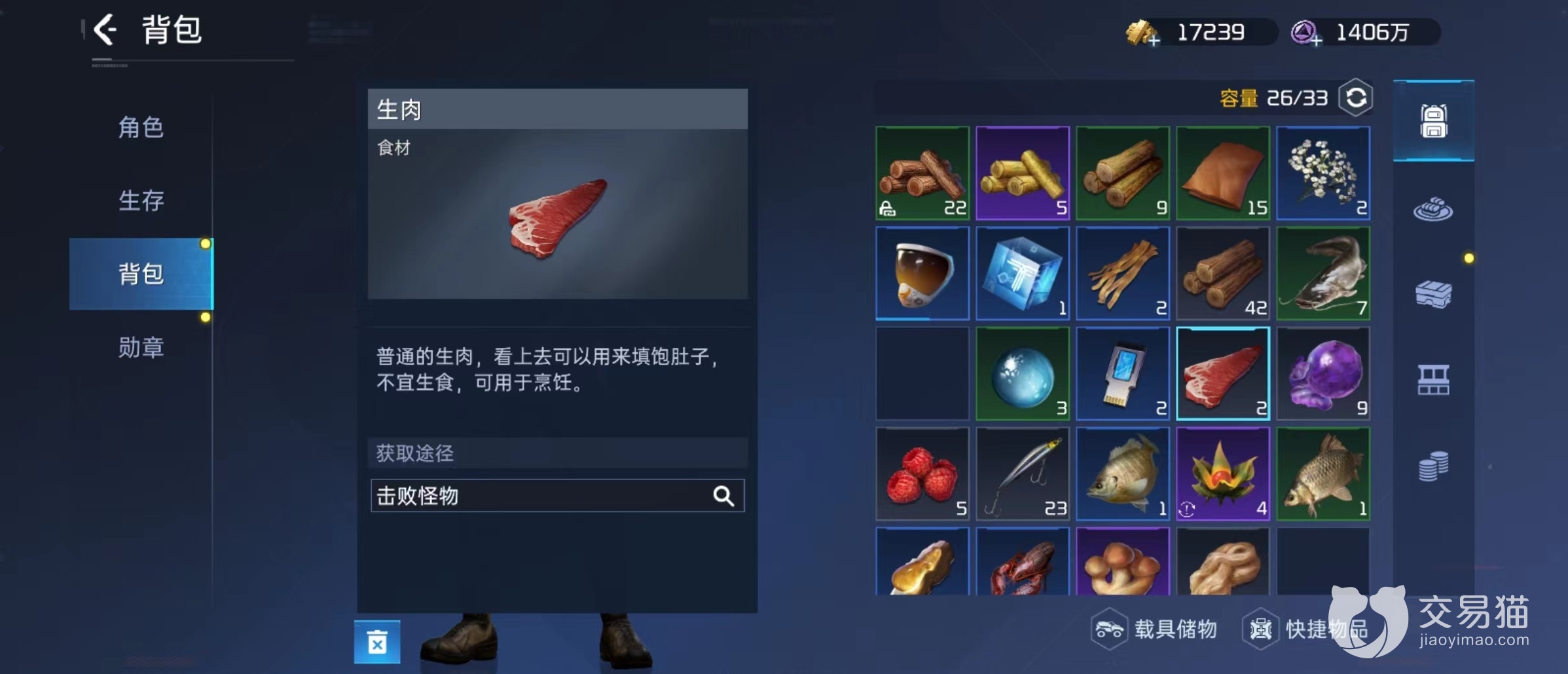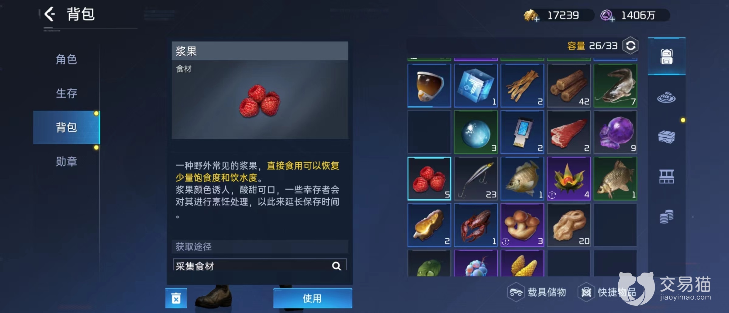食材收集起来也很简单,先说生肉,只需要狩猎任意动物就能够直接得到,当然也可能得到兽筋、皮类等资源,但多击杀几个肯定能够找到肉。纯净水就更加简单了,直接去据点接取水凝胶就能当做食材使用。最后浆果同样是收集地图上资源来得到,有时还能出现一些意想不到的伴生品。对浆果种类没有需求,无论是杜加河谷或是尖叫戈壁,获取的水果都能够直接使用。但需要注意的是,千万不要做成了水果肉串,这两种配方是比较相似的。