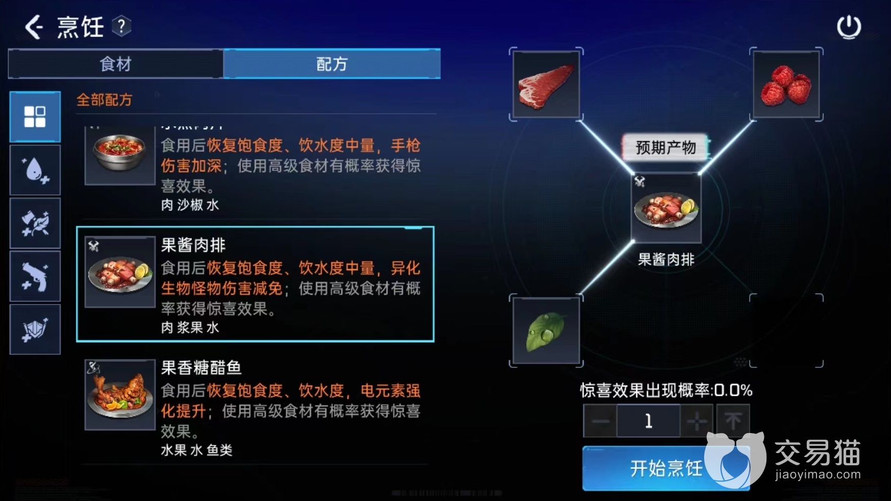 果酱是非常甜的甜食,而肉排又是深受大家喜欢的肉食,两者放到一起所生成食物自然非常美味,在星球重启中就为大家提供了制作方式,今天就一起来看下星球重启果酱肉排怎么做。这是一股能够提供三种不同效果的精致烹饪料理,如果使用的是高级食材,还有概率获得惊喜效果,在制作时需要哪些原材料,一起看吧。