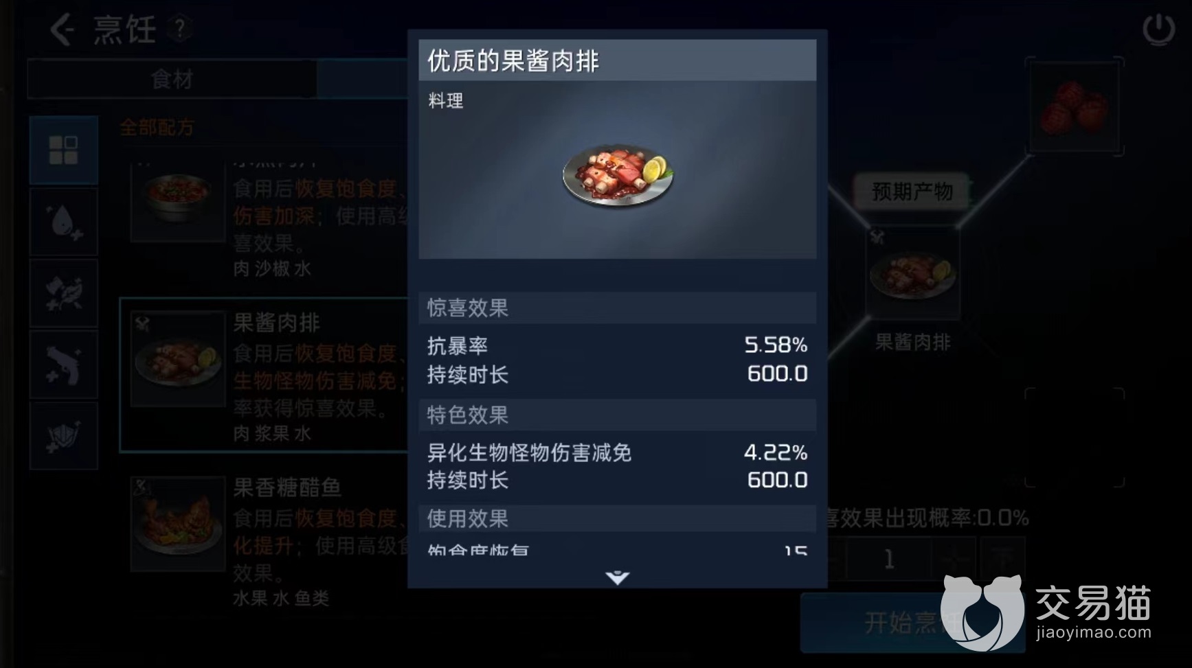 此外还有特殊效果能降低受异化生物怪物伤害,这是在实战中比较出色的效果,可以提高生存能力,运气够好得到惊喜效果能够提升抗暴力。即使没有惊喜效果仅仅是前面的两种就已经深受玩家喜爱。在战斗之前先吃下果酱肉排就可以少受伤害,具体的制作方式需要准备任意生肉一份,浆果一份和纯净水一份就能够直接得到。