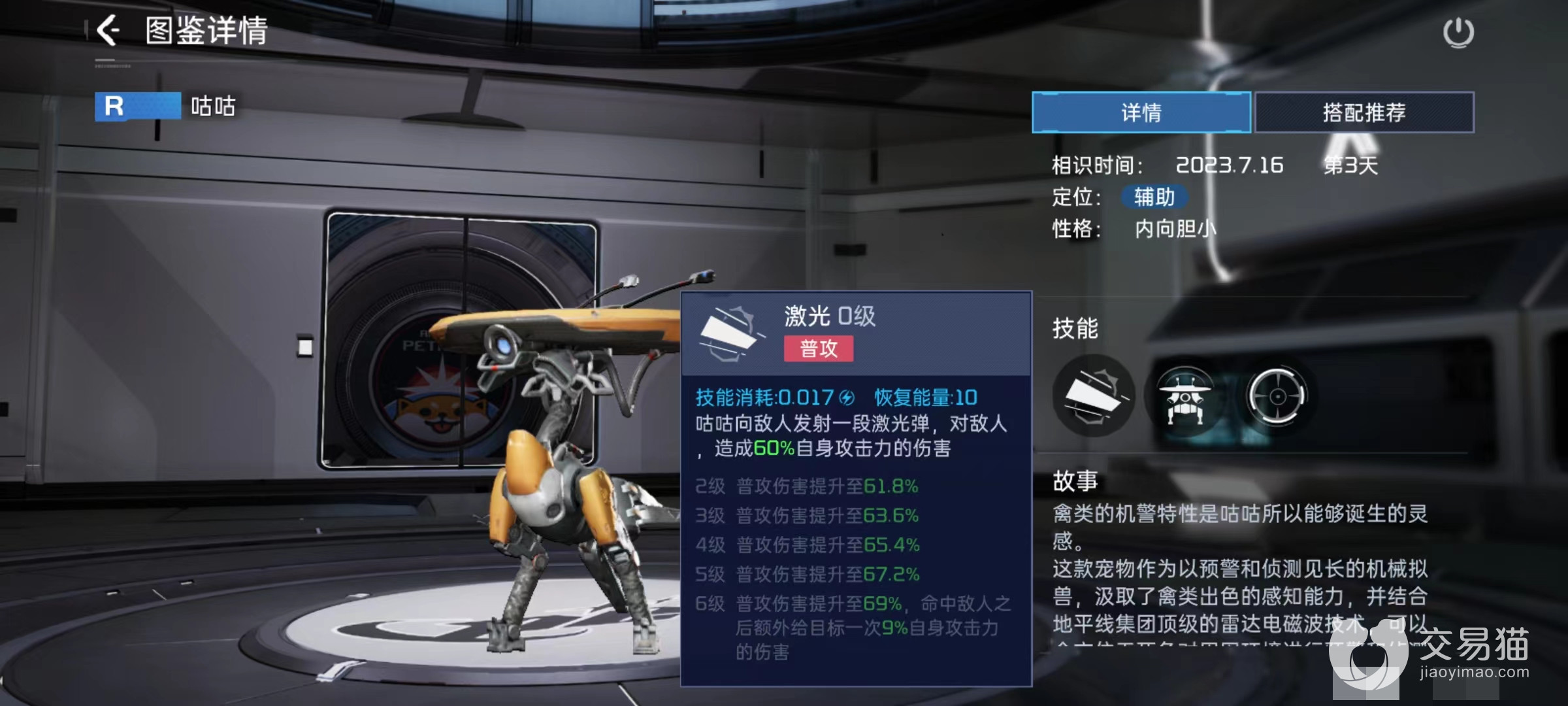 普攻技能激光向敌人发射出一段激光弹造成伤害,如果技能升到六级,在命中敌人之后会额外给目标造成一次伤害。主动技能侦测,开启侦测模式,标记周围距离玩家最近的一个敌人5秒钟,并且在地图或墙体阴影中显示出来。主人首次命中后对敌方造成减速效果,最多能降低到28.6%移动速度,持续5秒钟。当标记敌人在持续时间内被击败时,咕咕将会获得能量返还。