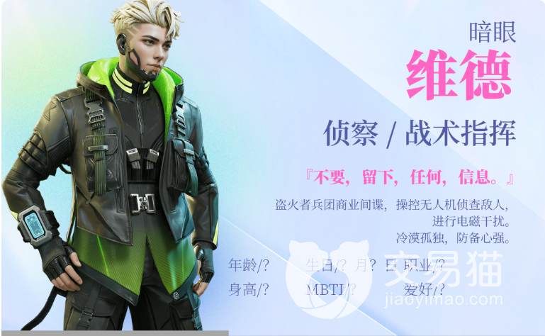 他的被动是信号定位,可以利用他扫描的功能来找出下一个需要的信号区,这个没有技能的冷却时间,追猎本能是另一个被动,他的这个被动能够将对手的脚步声进行显示,提示在准星附近,从而能够帮助自己和队友更快更准确的额寻找到对手的位置,狂烈脉冲是他的战术技能,狂烈脉冲这个技能主要是对周围的环境进行扫描,能够对半径60米之内的对手都进行检测,而且直接限时对手的位置持续五秒,这对于作战其实是非常重要的一个能力,暴露位置才能够更好的瞄准对手。
