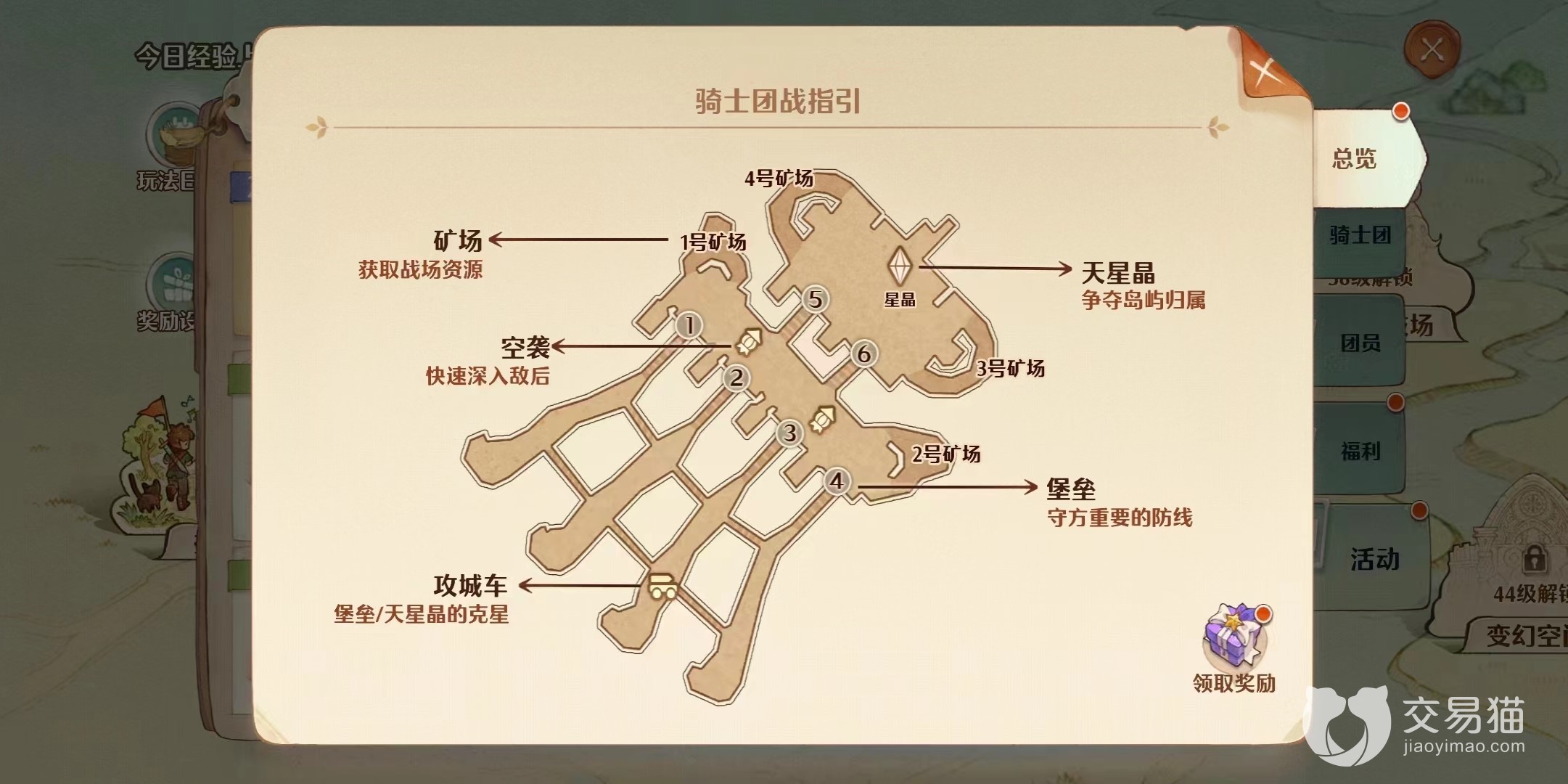 在准备组团这个内容的时候,要现在骑士团内组建好足够多的攻城车等重型武器。这个组建要靠骑士团内每个成员的付出。完成武器的准备之后具体就是开始实施攻岛了。在攻岛的时候按照下图的4个步骤。先是攻城车攻破堡垒的大门,然后抢占空军基地,向敌人后方投掷己方的队员方便侵占领地,最后的关键就是攻破敌方的天晶星,类似于王者的玩法。