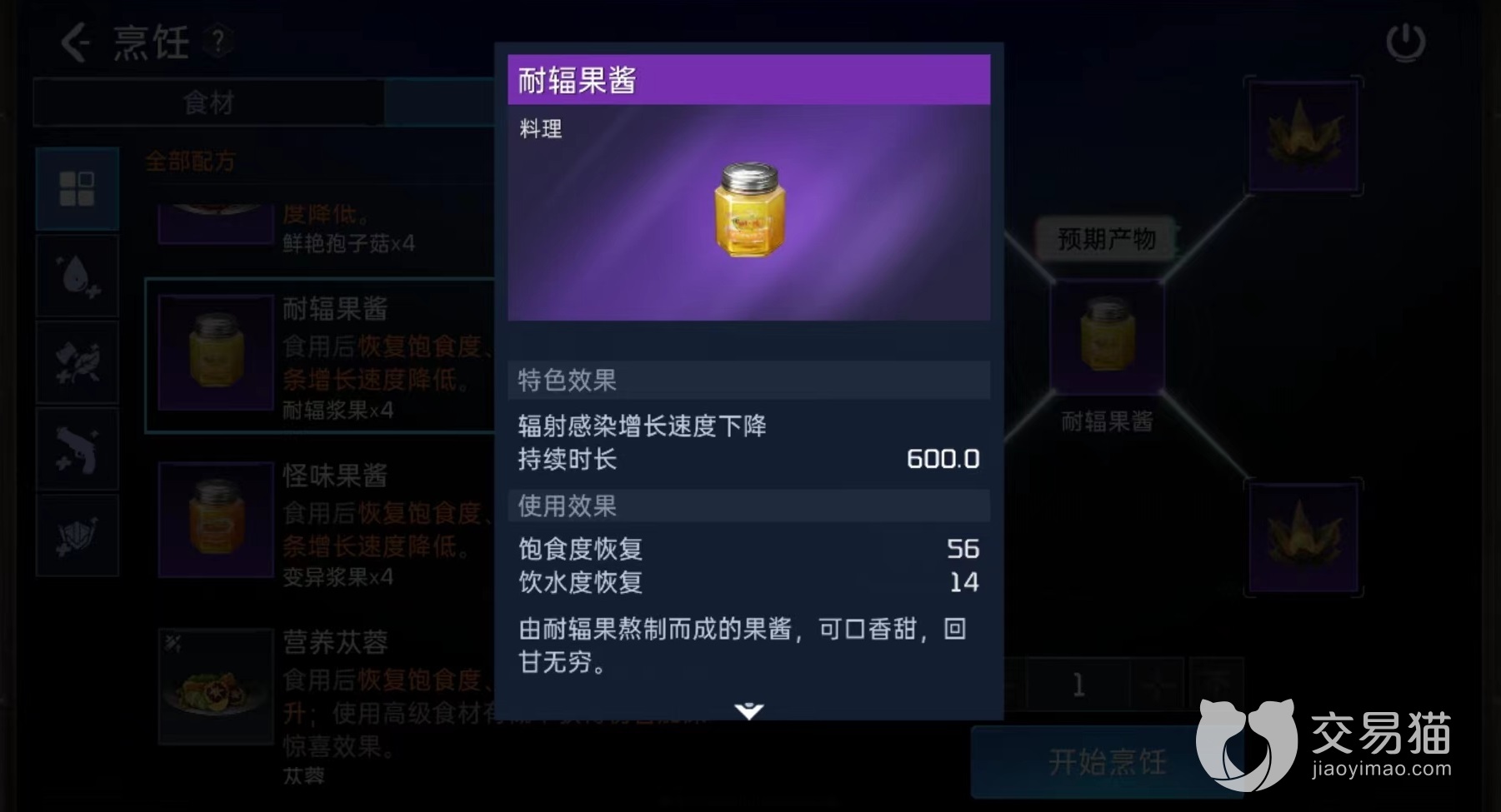 该烹饪使用之后,除了增加大量饱食度和饮水度之外,特色效果为降低辐射感染增长速度。大家都知道,在辐射地区长时间留存会不断累积感染指数,如果没有防范措施,对生存是很大影响。但使用了耐辐果酱以后,就能够在600秒时长内几乎不受干扰,可以自由冒险或者是收集其他材料。