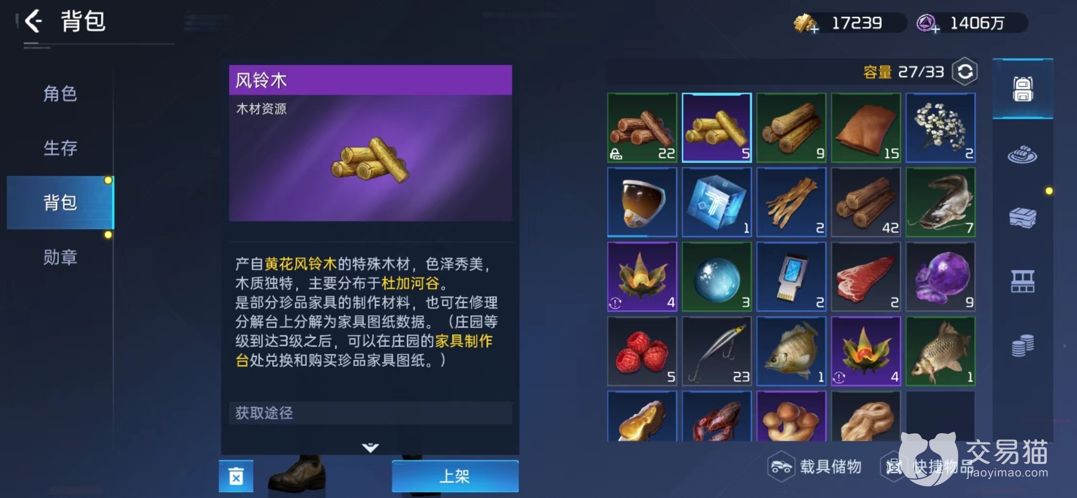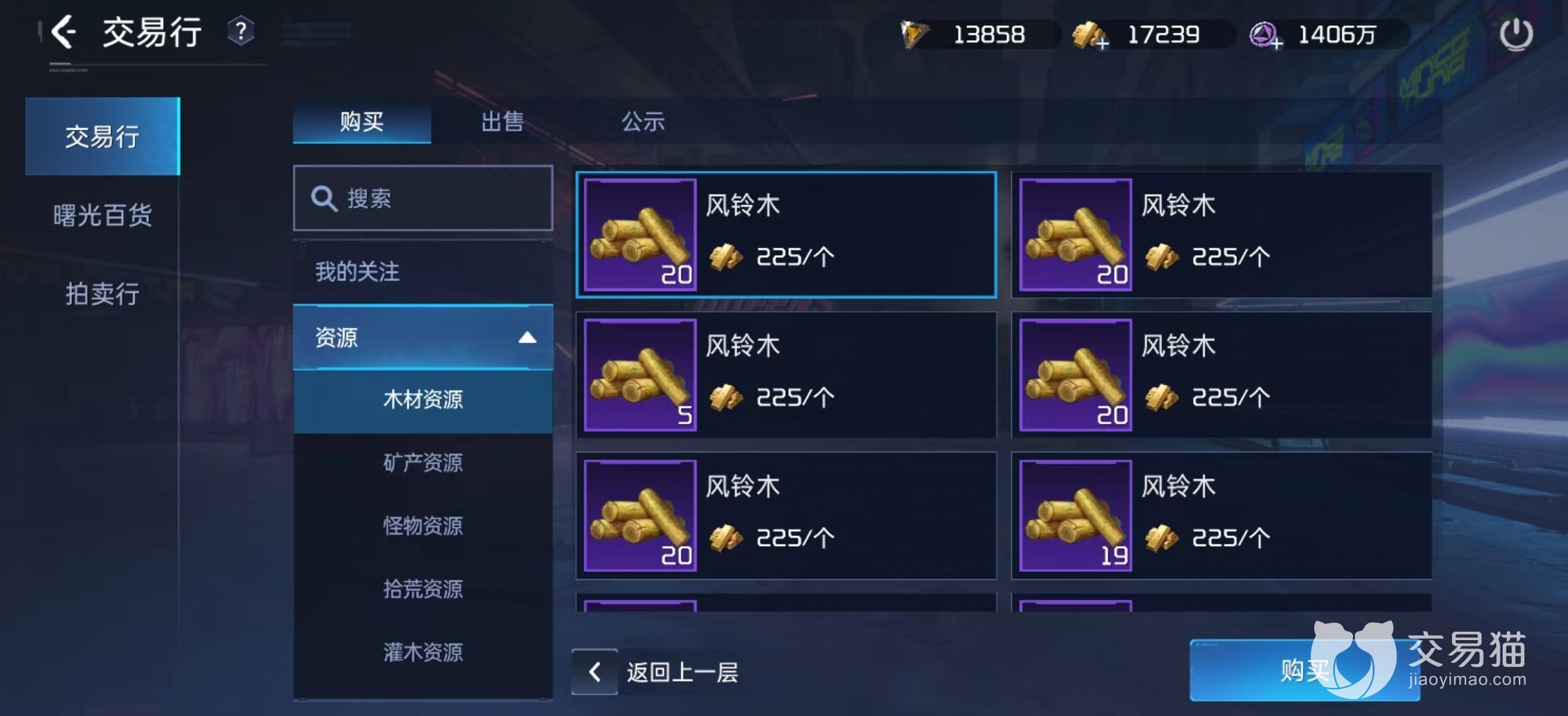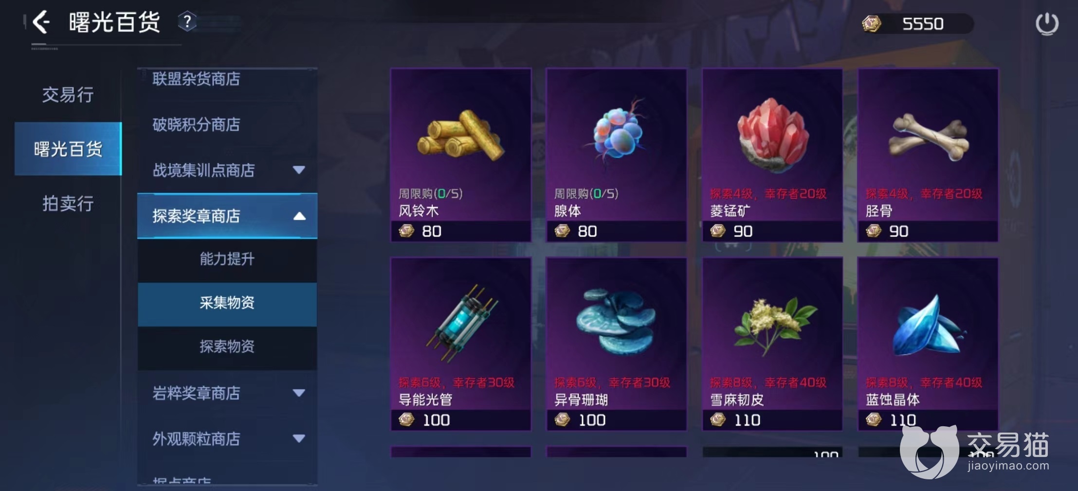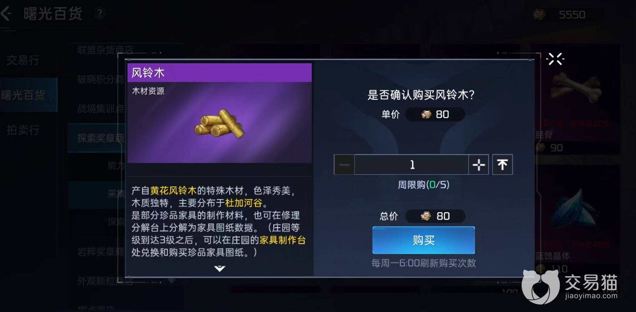 如果运气不够好找不到,还可以去探索奖章商店购买,这是比较靠谱的方式,在商店中采集物资页面,消耗探索奖章可以直接兑换。除了风铃木之外还有其他一些紫色材料,都是制作家具必备品。除了兑换之外,最后一项途径就是在交易行中购买。很多玩家都会选择将风铃木出售出去换取金条,毕竟制作家具并不是必要选项,换取到金条更容易提升战力。