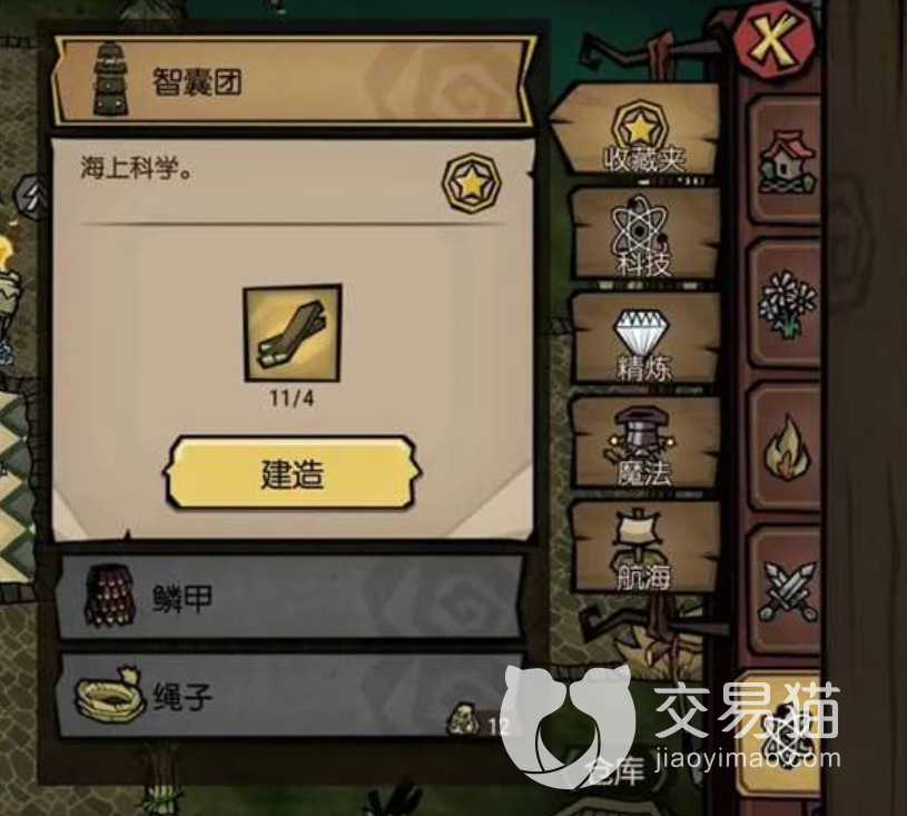 航海属于初级科技,但是玩家还是需要通过科技树将里面的智囊团进行解锁,解锁完毕以后就可以开始制作出大型船只以及船只用具,方便玩家们更好地渡海,点击航海图纸,在图纸上面有各个配件的制造材料,大部分材料都是可以通过小岛屿内部进行收集的。