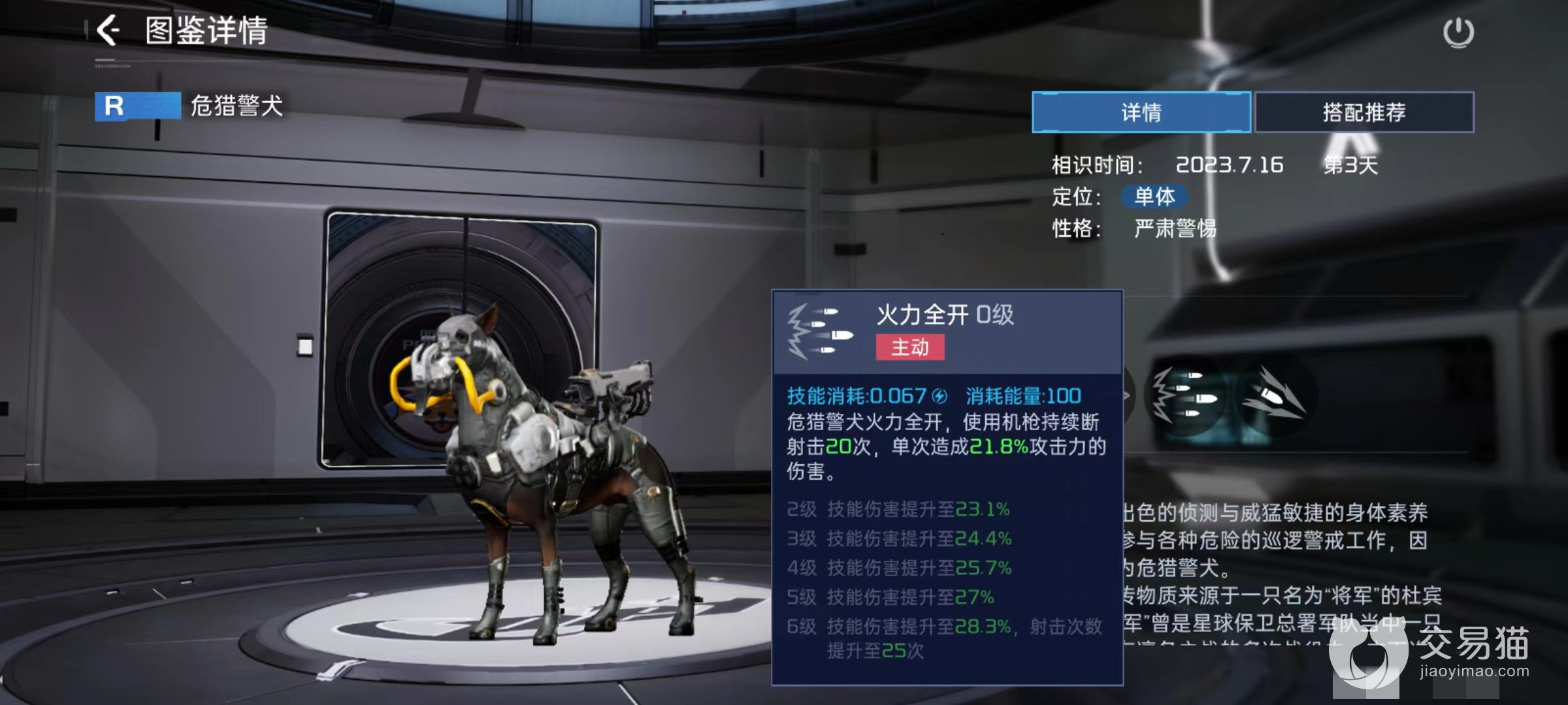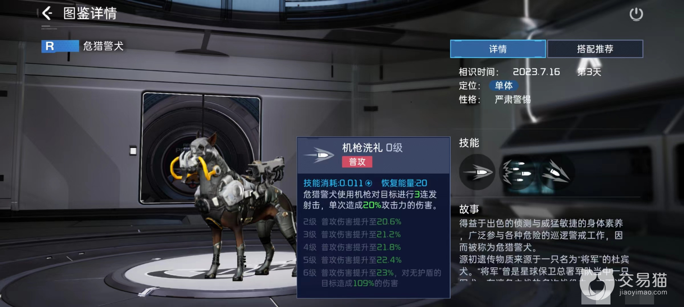 警犬拥有出色侦测与威猛敏捷身体素养,广泛从事各种巡逻警戒工作。它的原型就是一只功勋赫赫军犬,采用它的遗传物质以及特殊方式打造出了危猎警犬。普攻技能机枪洗礼,使用身上携带的机枪对目标进行三连发射击,升到六级以后获得对无护盾目标额外伤害效果。这样如果能够快速将目标身上护盾打掉,接下来在打击血量时候就能有着更好表现。
