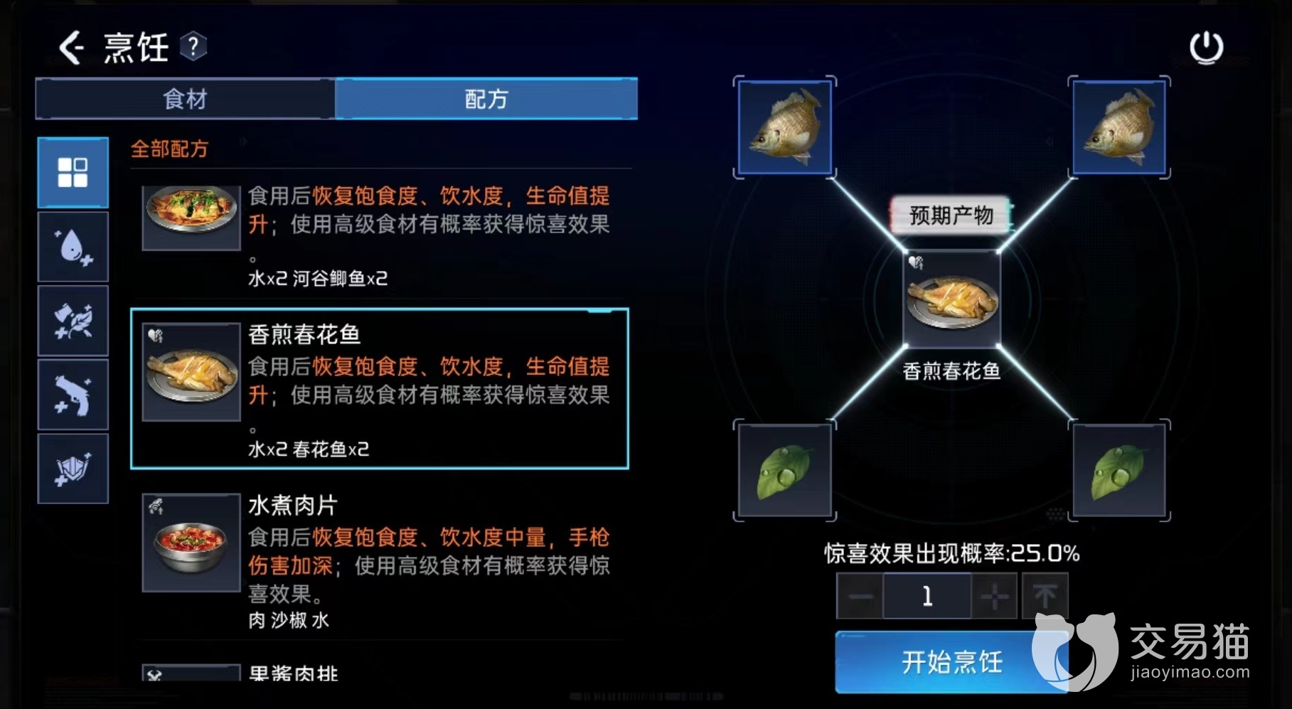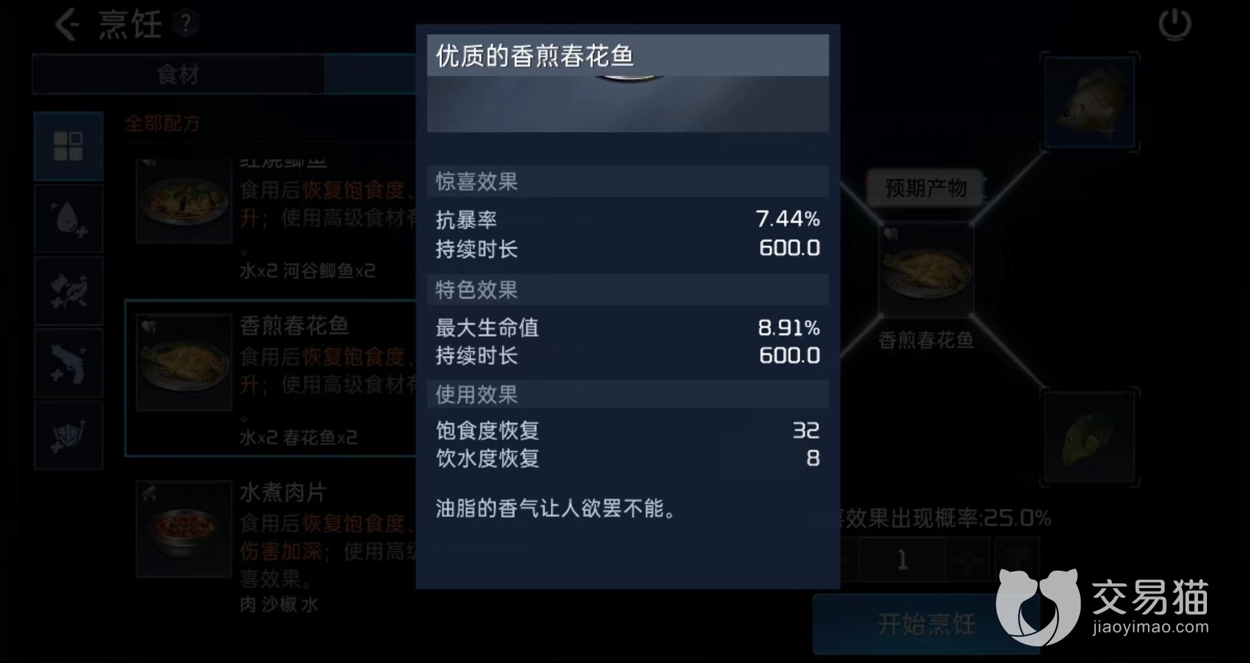 看完小编提供的配方之后,现在大家应该就知道星球重启香煎春花鱼怎么做了吧,这种食物属于功能类型,并不用来单纯填饱肚子,所以可以适当注意提升一下品质,这样能够获得更加出色的效果。