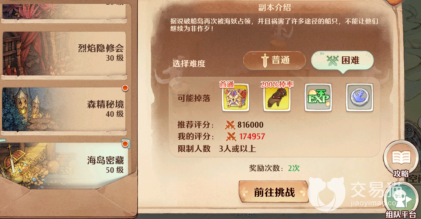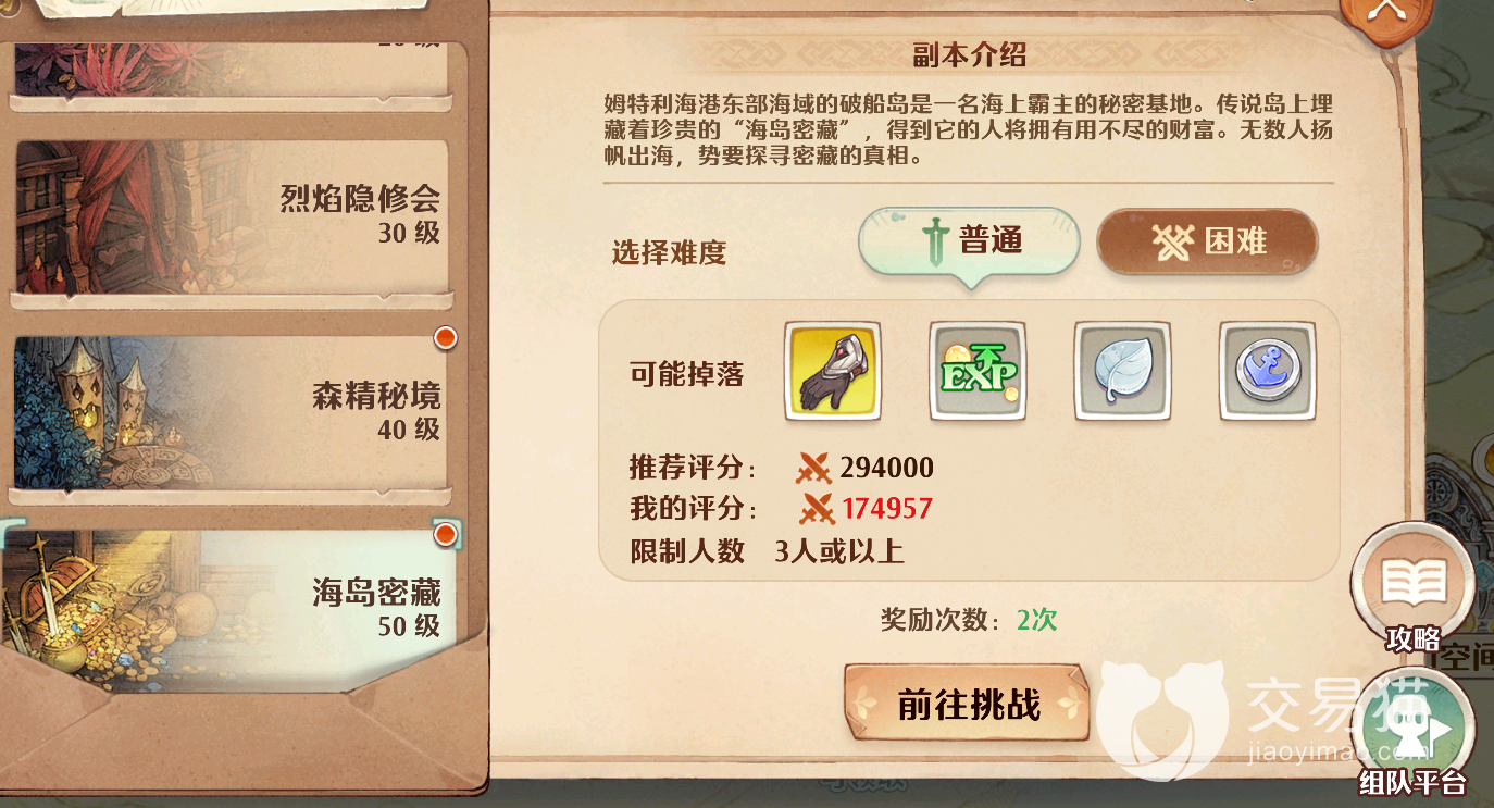 海岛密藏的普通难度与困难难度其要求也是不一样的,新手朋友建议先从普通难度打起,虽然它的奖励肯定不如困难丰厚,但你的评分只需要达到294000以上就可以很容易打过了,提升评分的方法也比较统一,只需要从装备,猫灵,卡牌和幻果四个方面着手即可,提升它们的品质和强化等级能够让你的评分快速达标。