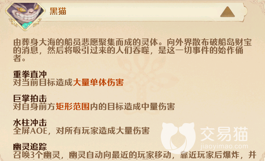 至于“黑猫”的话它则拥有五个技能,想击败它的话除了单纯的躲避技能伤害以外,还要特别注意一下它的“幽灵追踪”和“水牢禁锢”技能,前者会召唤自爆幽灵靠近玩家,看到的时候就要提前远离,后者则会放置一个水牢控制玩家,需要玩家及时攻击水牢从而打破它的禁锢。