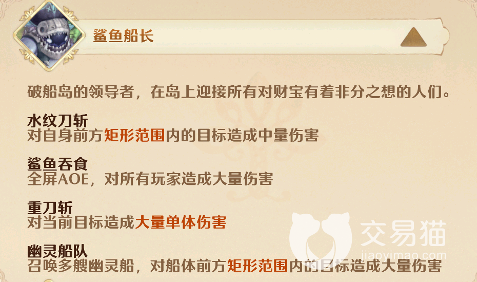 困难难度的话要求的评分则会更高一些,需要达到816000以上才能够比较轻松的打过这一副本,另外不管是哪个难度,对付其中的boss时,都需要结合它的技能来及时做出合理的应对,里面有两个boss,首先是有四个技能的鲨鱼船长,打它需要注意躲避一下矩形范围的水纹刀斩,另外鲨鱼吞食,重刀斩和幽灵船队释放时都有明显前摇,也可以观察后轻松躲避。