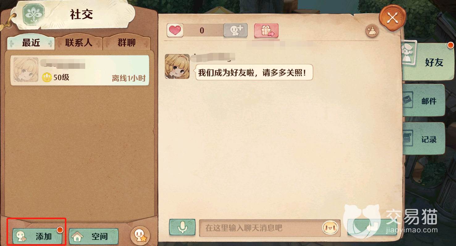 首先点击左下角的“社交”选项,点击之后你就会进入到对应的社交界面,这里面有“好友”,“邮件”和“记录”三个板块,选择好友这一板块之后,点击左下角的“添加”选项即可进行之后的好友添加事宜。