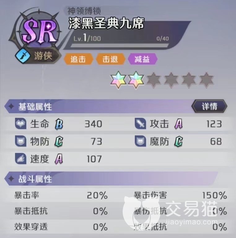 漆黑圣典九席是定位是游侠,比较有机动性的输出角色,基础属性只有攻击力和速度是A级,双防和生命值都偏低。