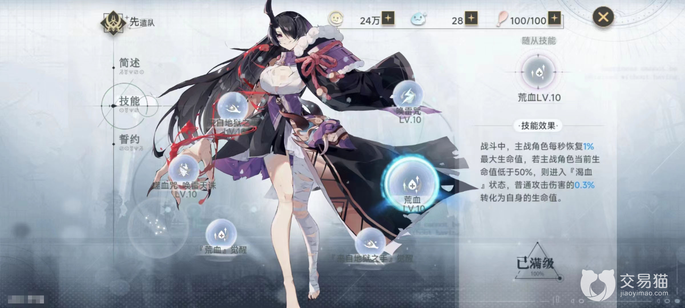 罗刹子被动技能是具有一定的恢复的能力,当主战角色生命值低于50%,就会进入【渴血】状态,普通攻击的0.3%伤害会转化为自身的生命值。