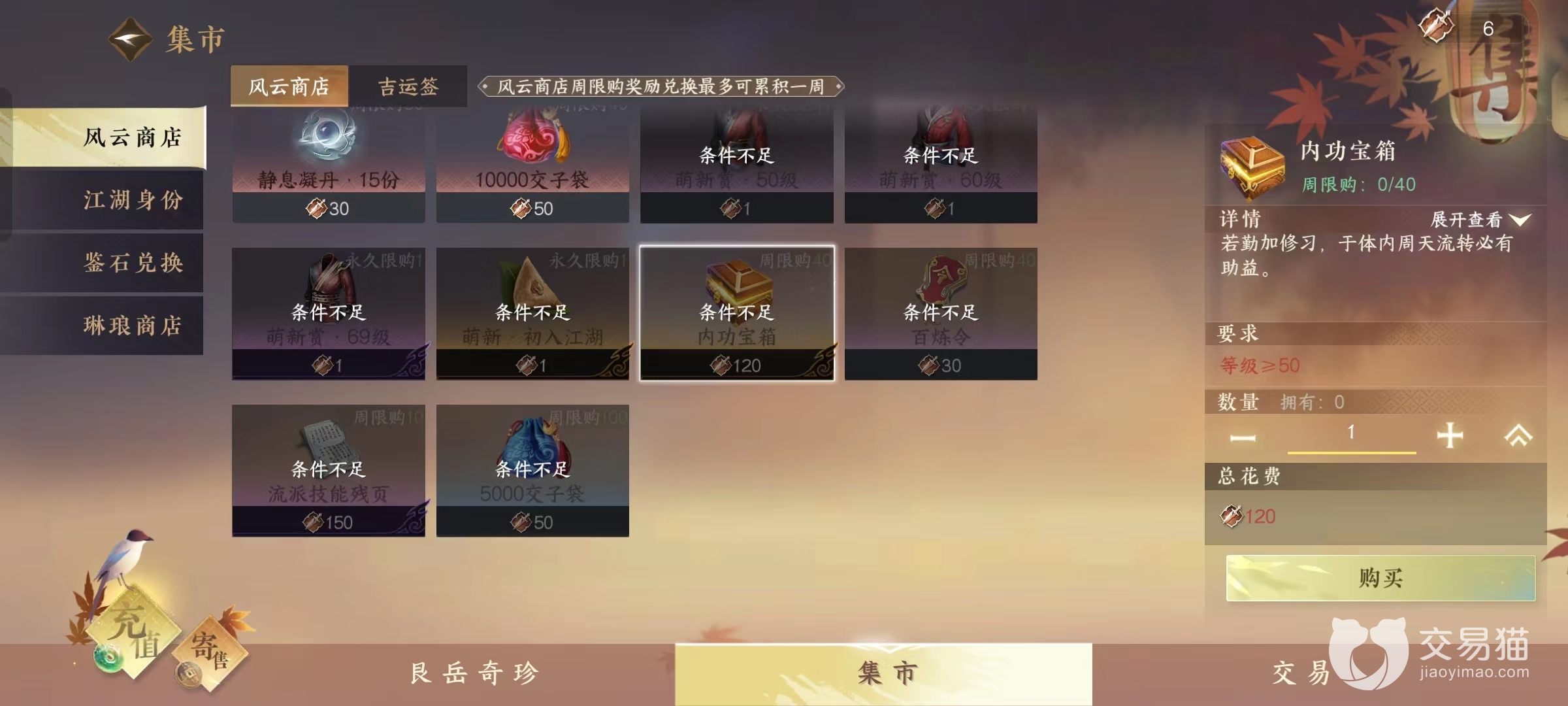 集市—风云商店 | 宝箱里出现的金色内功是随机的,但需要480风云令,一周只能买四个宝箱 | 与基础宝箱一样 | 等级大于等于50 |