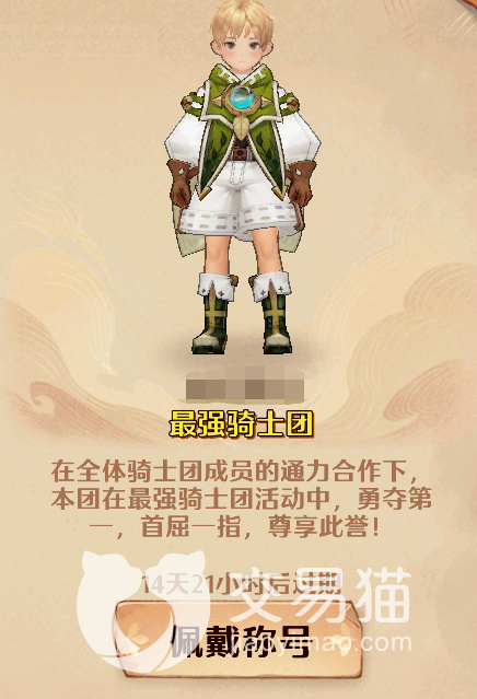 最强骑士团:这个称号显然与骑士团有关,它需要你所在骑士团在最强骑士团活动中拔得头筹才能够获取,这是全团成员的荣誉,所以每个成员都能够佩戴此称号。