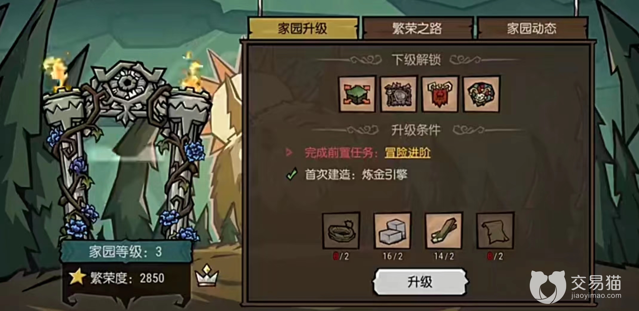 如果玩家想要升级家园的话,需要满足几个条件,首先需要玩家去完成前置任务,游戏里面有非常多的挑战,而这些都是和家园有着密不可分的联系的,只有将这些挑战全部完成了以后,才可以达到相应的冒险指南任务,之后只需要跟着冒险指南去完成一下相关的任务,以及要求就行了。