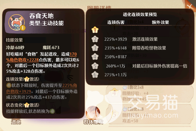 好吃喵的属性主要是【冒险专家】,这个属性与技能释放的伤害有很大关联,技能属性属于群体爆发伤害,好吃猫使用【吞食天地】:消耗673点魔法值后,会对敌人发起攻击,造成170%的角色物攻,额外增加2228点固定伤害,最多可以对目标攻击6次,在对最后一个目标进行攻击的时候会额外造成2次伤害,2次伤害攻击25%,附加328点伤害。
