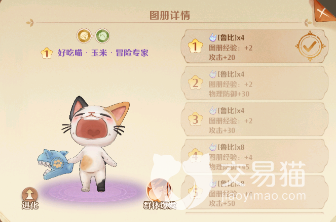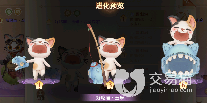 这个猫咪设计的非常的呆萌,而且是为数不多的紫色品级中强化后可以升级外观的,确实让人非常心动,猫灵的全称是【好吃喵·玉米】强化属性方面主要是增加角色的【物理防御】和【攻击】,这些属性是每一个猫灵强化后都会有的,只是属性的加成不太一样。