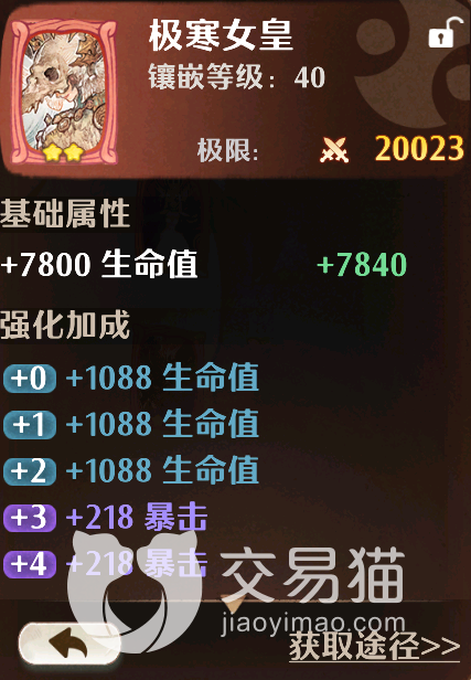 极寒女皇:这个是万灵系列卡牌,在红色品质的保障下其基础属性也是给到了7800的生命,通过后续强化还能提供额外的生命值,暴击与无视部分防御的加成,这些加成对于进攻端的提升非常明显,不仅让你有更多几率打出高倍伤害,而且还十分克制高防御的对手,不过它的同名卡加成则是单纯的生命和暴击加成,这个不如强化阶段提供的加成全面,但整体来看还是对攻防两端都有所兼顾。