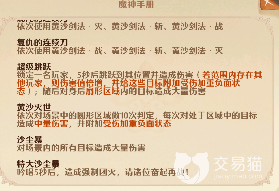 然后黄沙灭世这招虽然会在大范围的区域内做十次判定,但都可以提前预判闪避,而沙尘暴和特大沙尘暴则均有着吟唱和准备时间,也可以根据boss的动作提前做出闪躲准备。